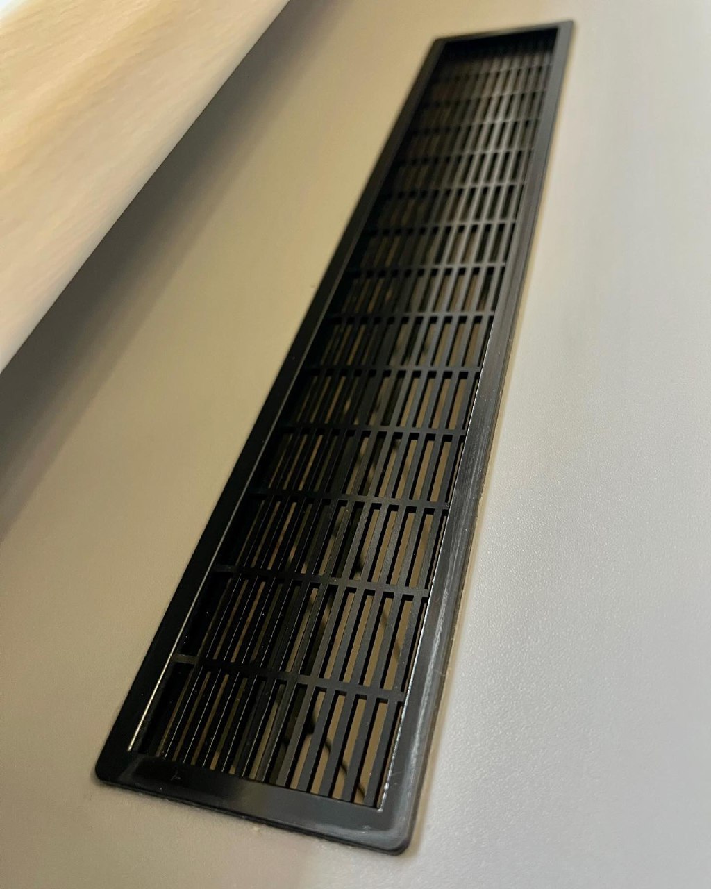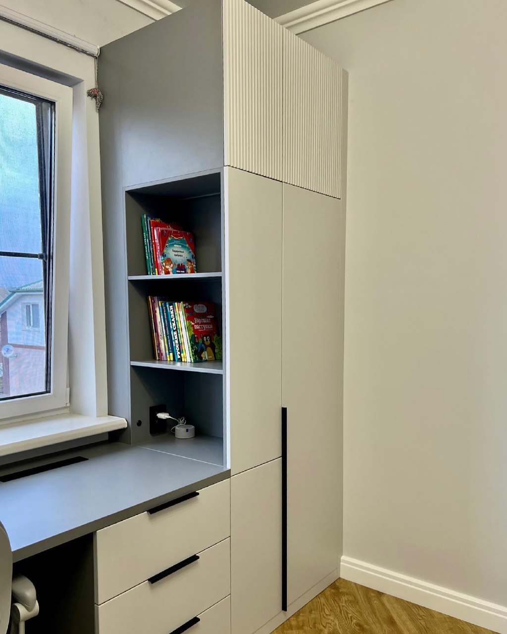 Детская мебель выполнена в современном стиле и сочетает в себе функциональность и лаконичный дизайн. По обе стороны от окна расположены вместительные шкафы со светлыми фасадами и вертикальными чёрными ручками-вставками. Верхняя часть шкафов украшена декоративными рифлёными панелями, что добавляет текстуры и делает дизайн более интересным.