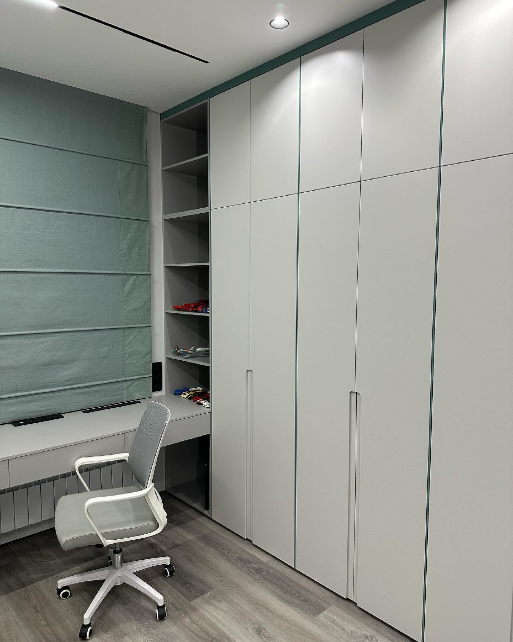 Светло-серые фасады мебели сочетаются с акцентными вставками в мягком мятном оттенке, который повторяется в римской шторе. Такое решение создаёт спокойную атмосферу, способствующую учёбе и отдыху ребёнка.