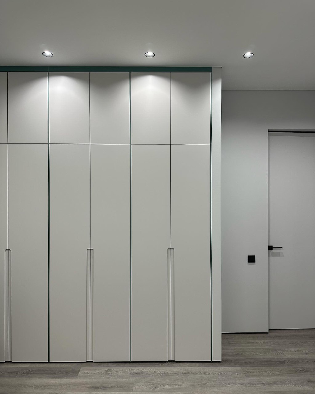 Детская мебель выполнена в современном минималистичном стиле с акцентом на функциональность и чистые линии. Вдоль стены расположены встроенные шкафы и открытые стеллажи, которые обеспечивают удобное хранение книг, игрушек и личных вещей.