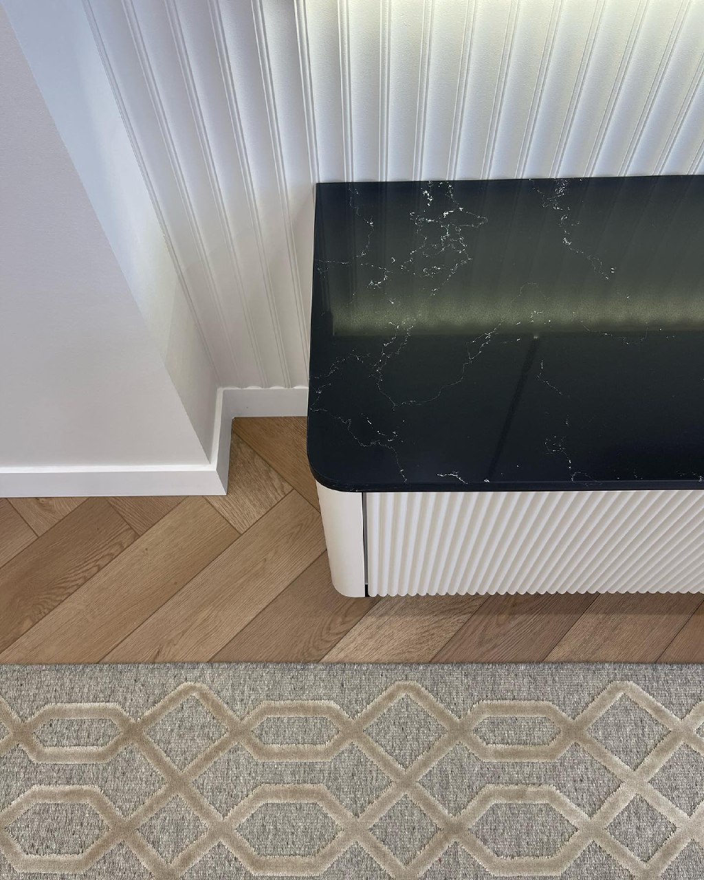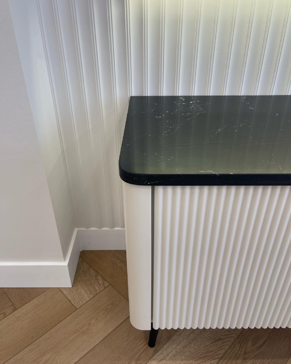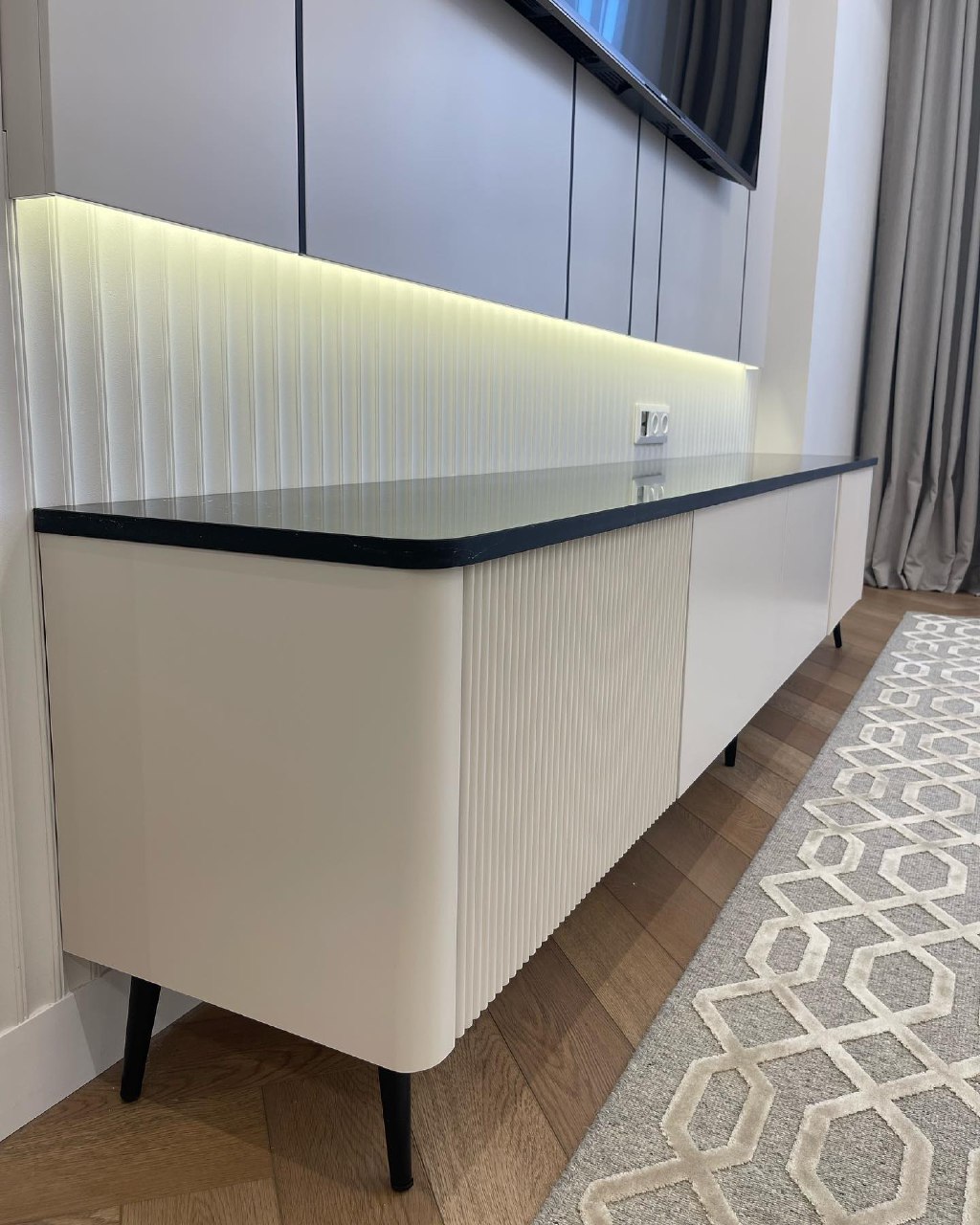 Тумба под телевизором имеет рифлёные боковые фасады и гладкие центральные дверцы, а тёмная столешница создаёт контраст и завершённый вид. Низкие ножки придают конструкции лёгкость, визуально приподнимая её над полом.