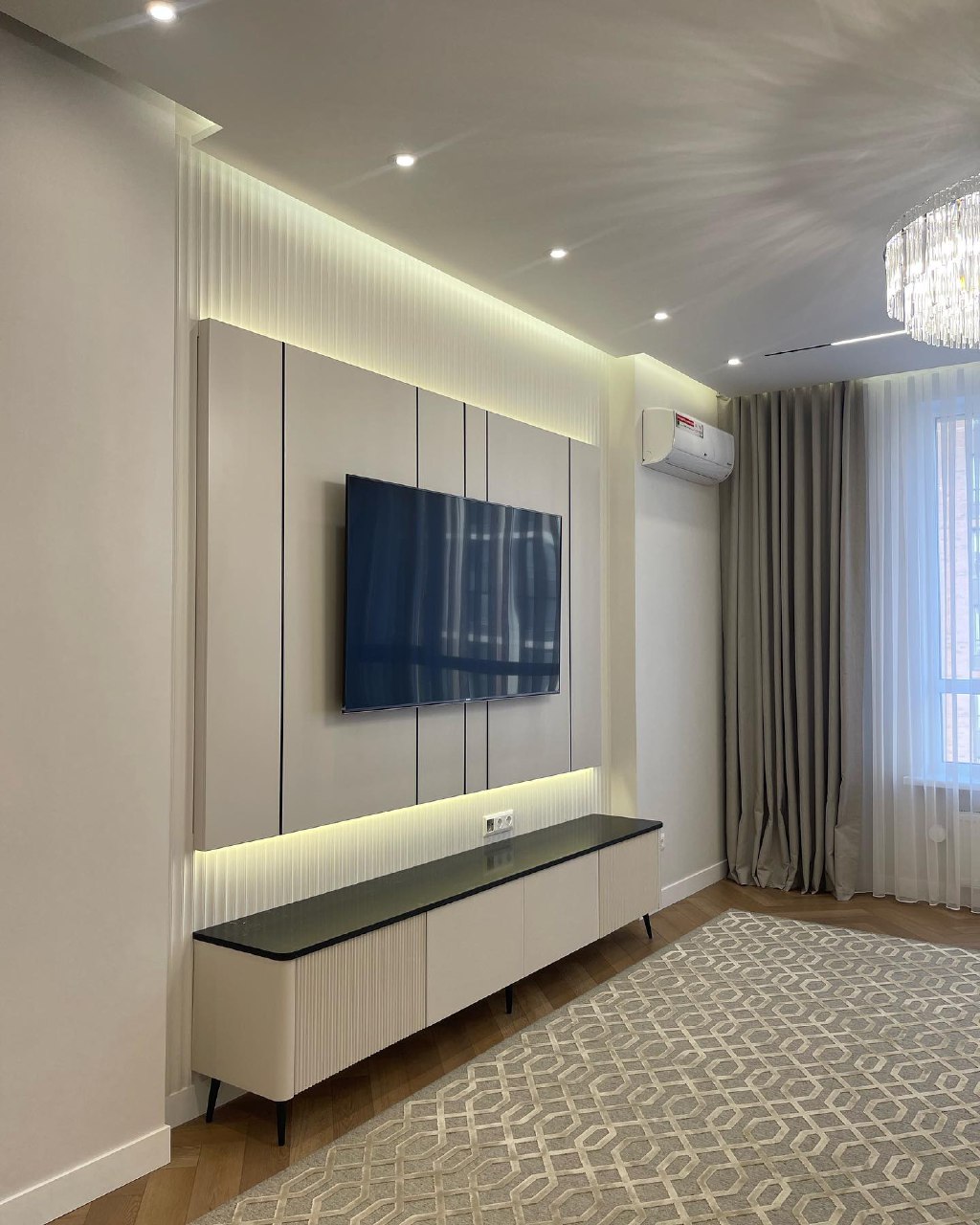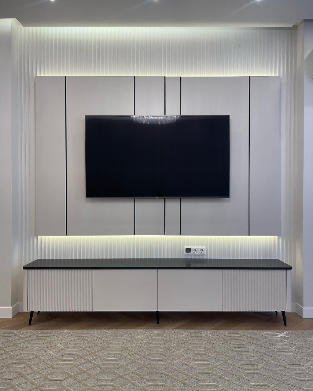 Мебель в гостиной выполнена в современном минималистичном стиле. Центральное место занимает телевизионная зона с декоративными панелями в светлых тонах и вертикальными акцентными линиями. Подсветка по периметру добавляет глубину и делает композицию более эффектной.