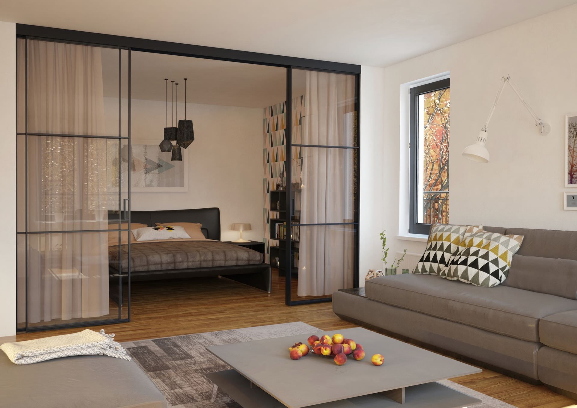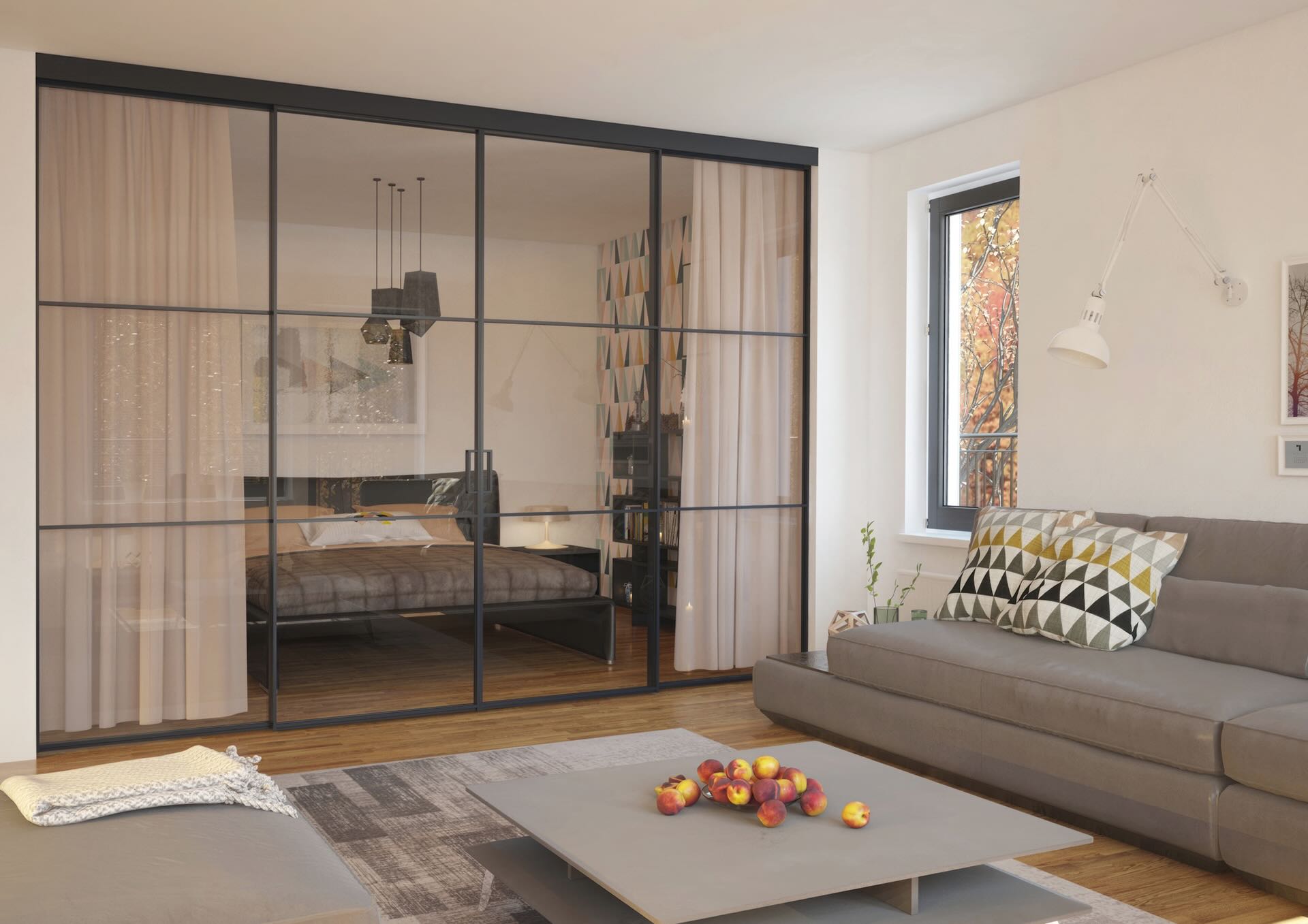 Межкомнатные перегородки «GRACE» для зонирования гостиной и спальни создают ощущение простора и лёгкости, сохраняя естественное освещение и гармонию в интерьере. Узкий алюминиевый профиль с видимой частью всего 12 мм придаёт конструкции лаконичный и изящный вид, идеально вписываясь в современные стили оформления.