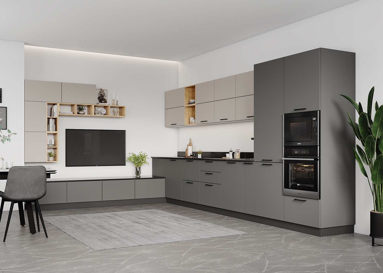 Фасады выполнены из ПВХ-плёнки премиального класса, придающей кухне элегантный вид и при этом устойчивой к царапинам, загрязнениям и воздействию бытовой химии. Такая поверхность не только выглядит как эмаль, но и тактильно приятна, что делает «Виано» отличным выбором для тех, кто ценит комфорт и долговечность.