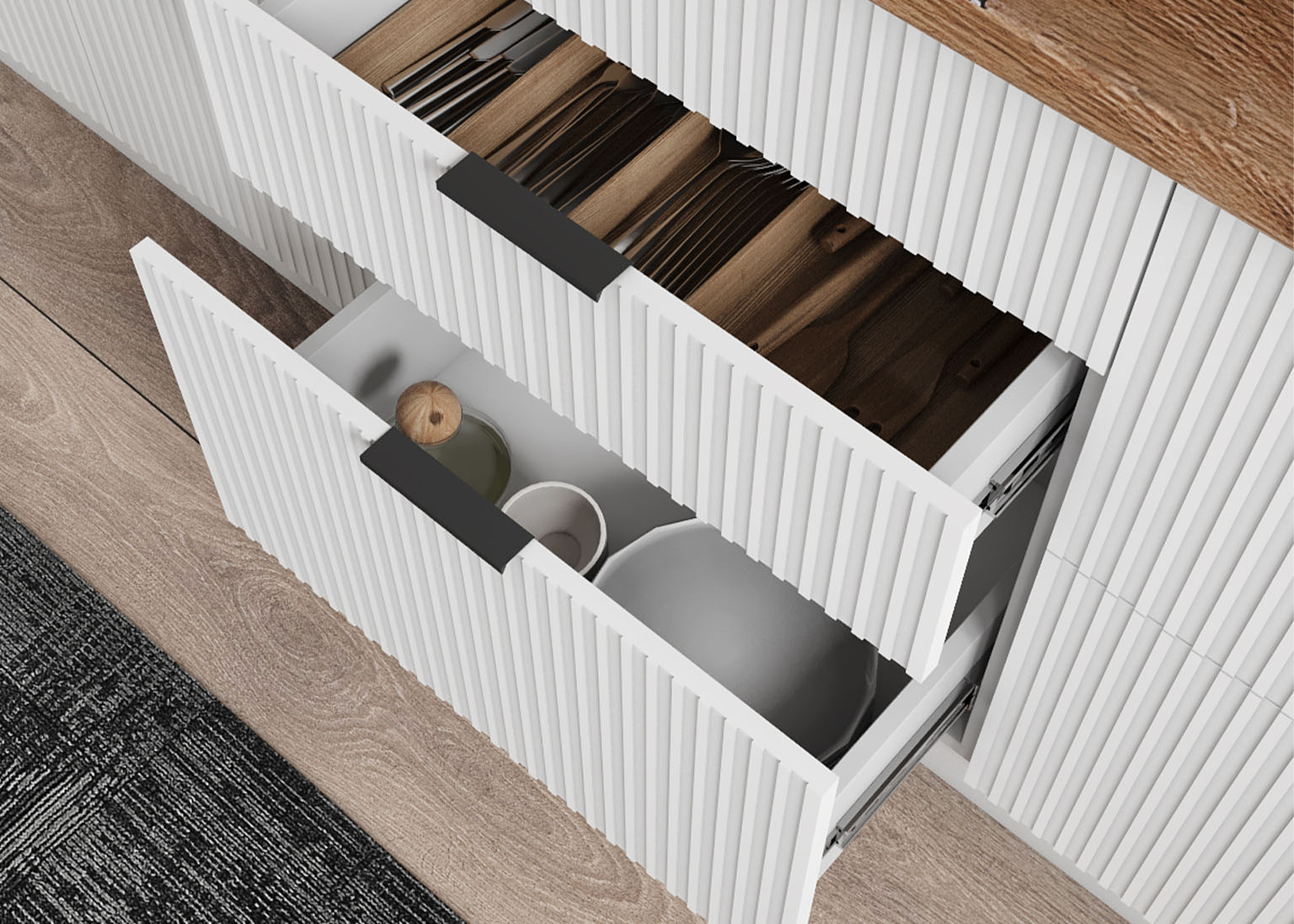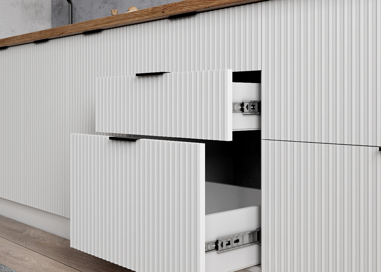 • Шариковые направляющие полного выдвижения обеспечивают плавность хода ящиков и удобный доступ к содержимому.