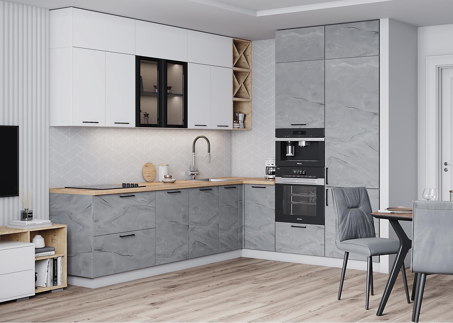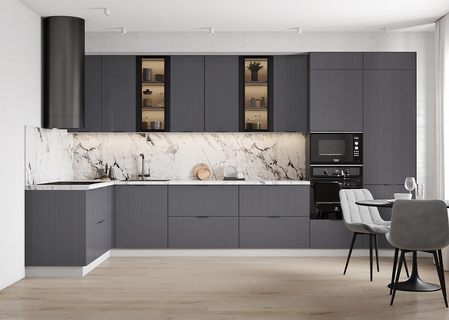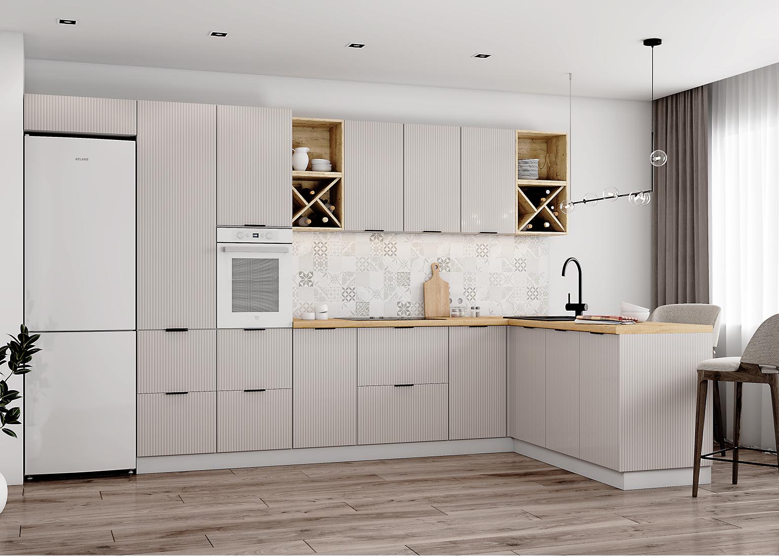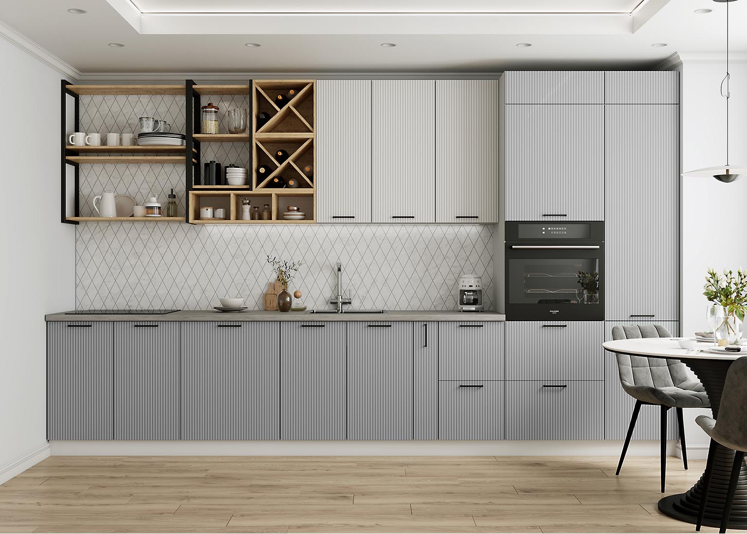 Главная особенность модели — отсутствие фрезеровки на фасадах. Это придаёт кухне элегантность, упрощает уход и делает её более устойчивой к повреждениям. Фасады можно доукомплектовать ручками на ваш вкус.