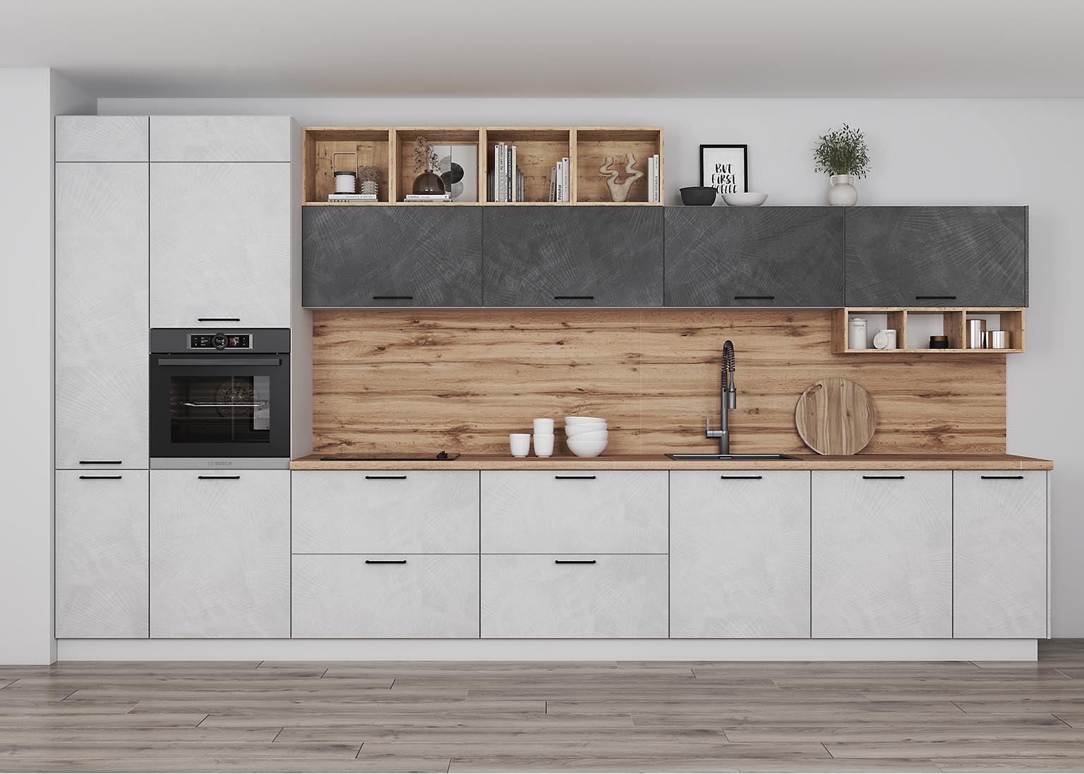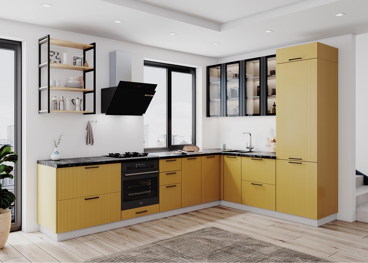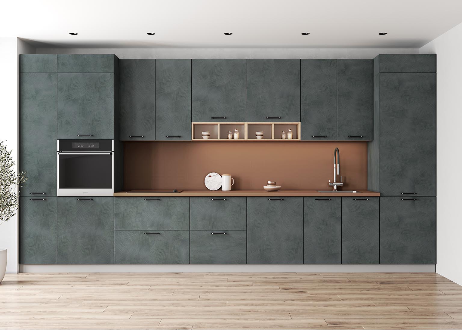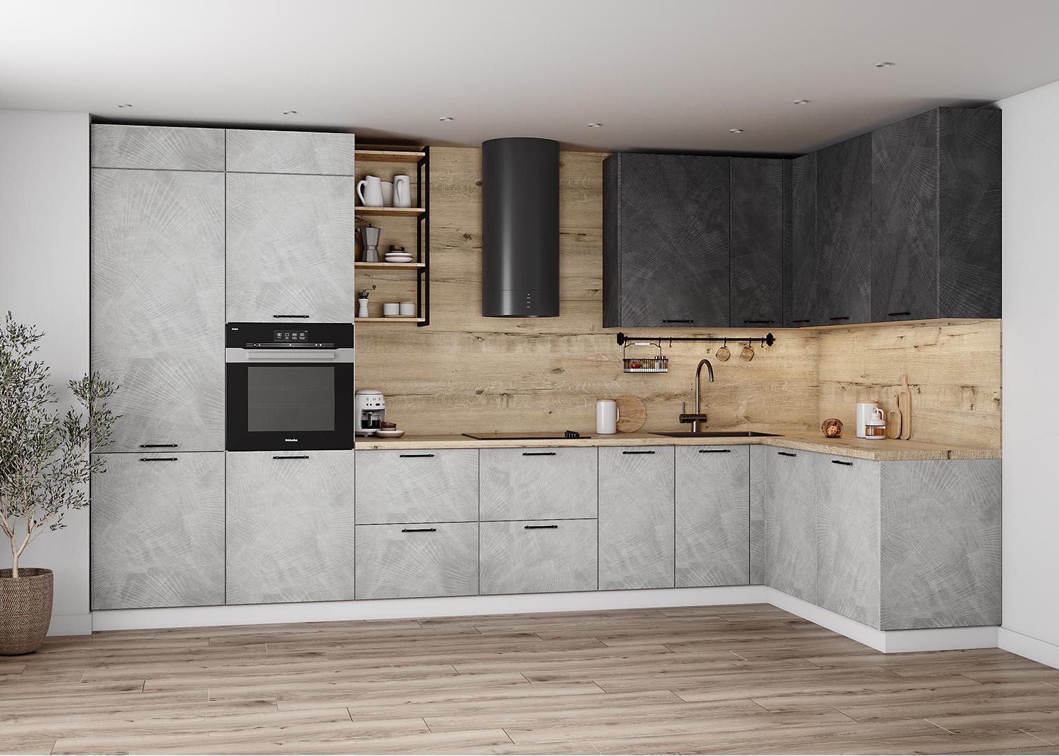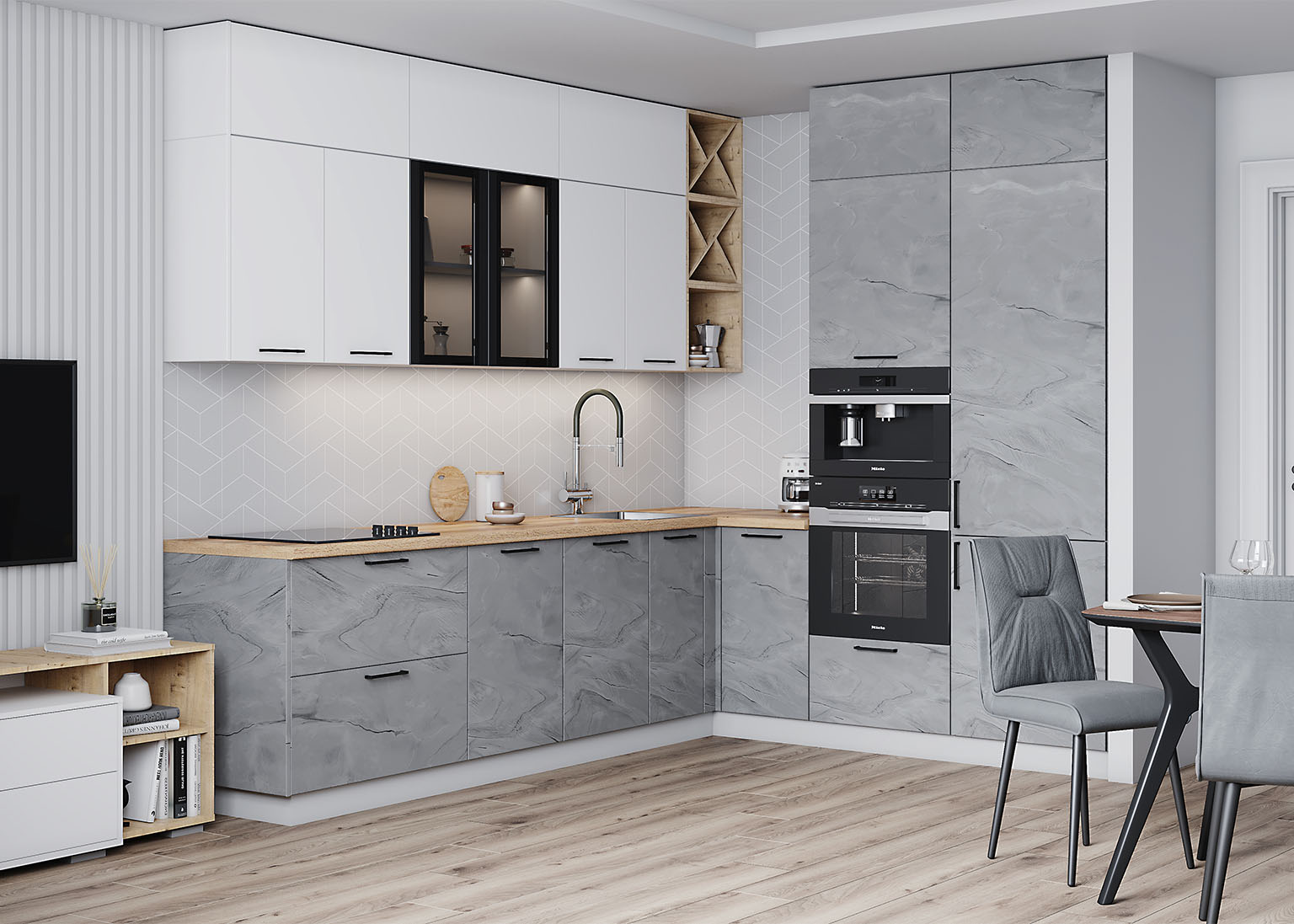 Главная особенность модели — отсутствие фрезеровки на фасадах. Это придаёт кухне элегантность, упрощает уход и делает её более устойчивой к повреждениям. Фасады можно доукомплектовать ручками на ваш вкус.
