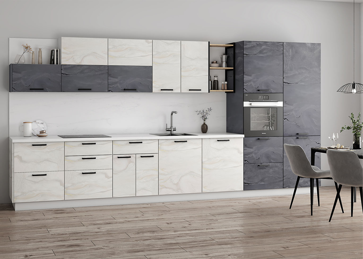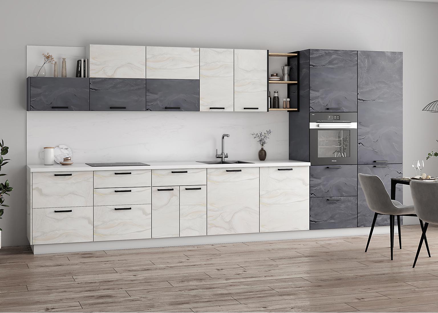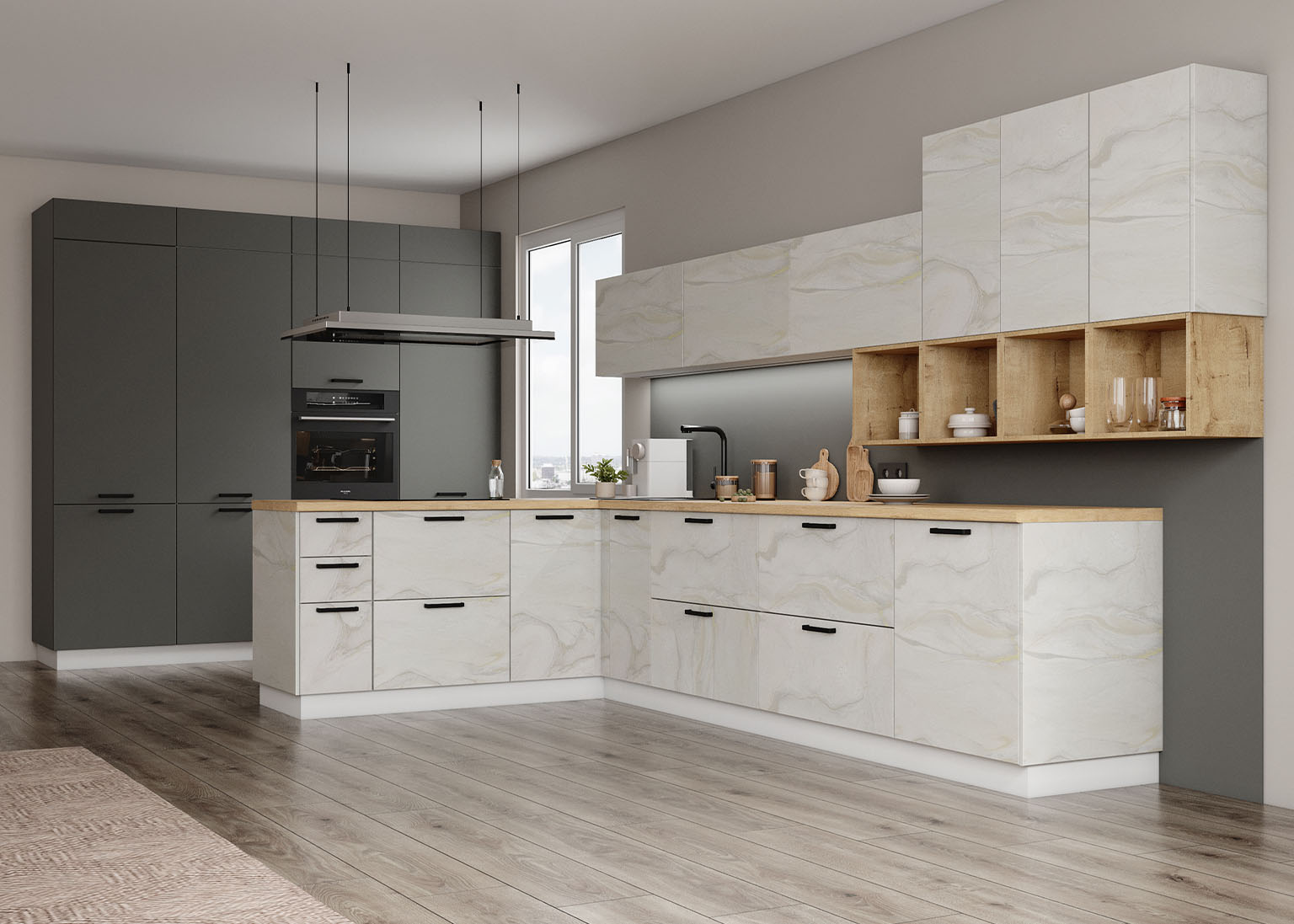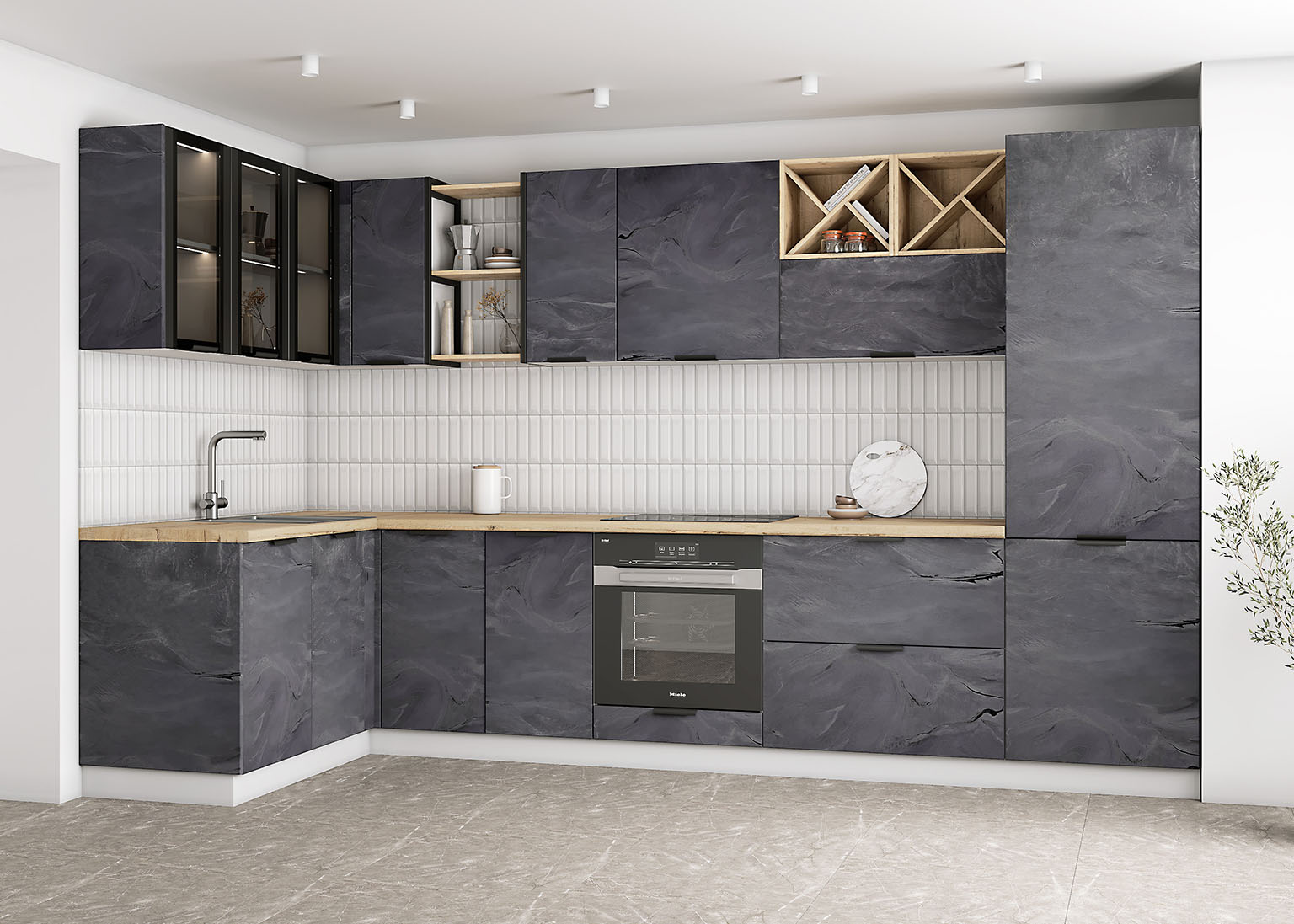 Главная особенность модели — отсутствие фрезеровки на фасадах. Это придаёт кухне элегантность, упрощает уход и делает её более устойчивой к повреждениям. Фасады можно доукомплектовать ручками на ваш вкус.