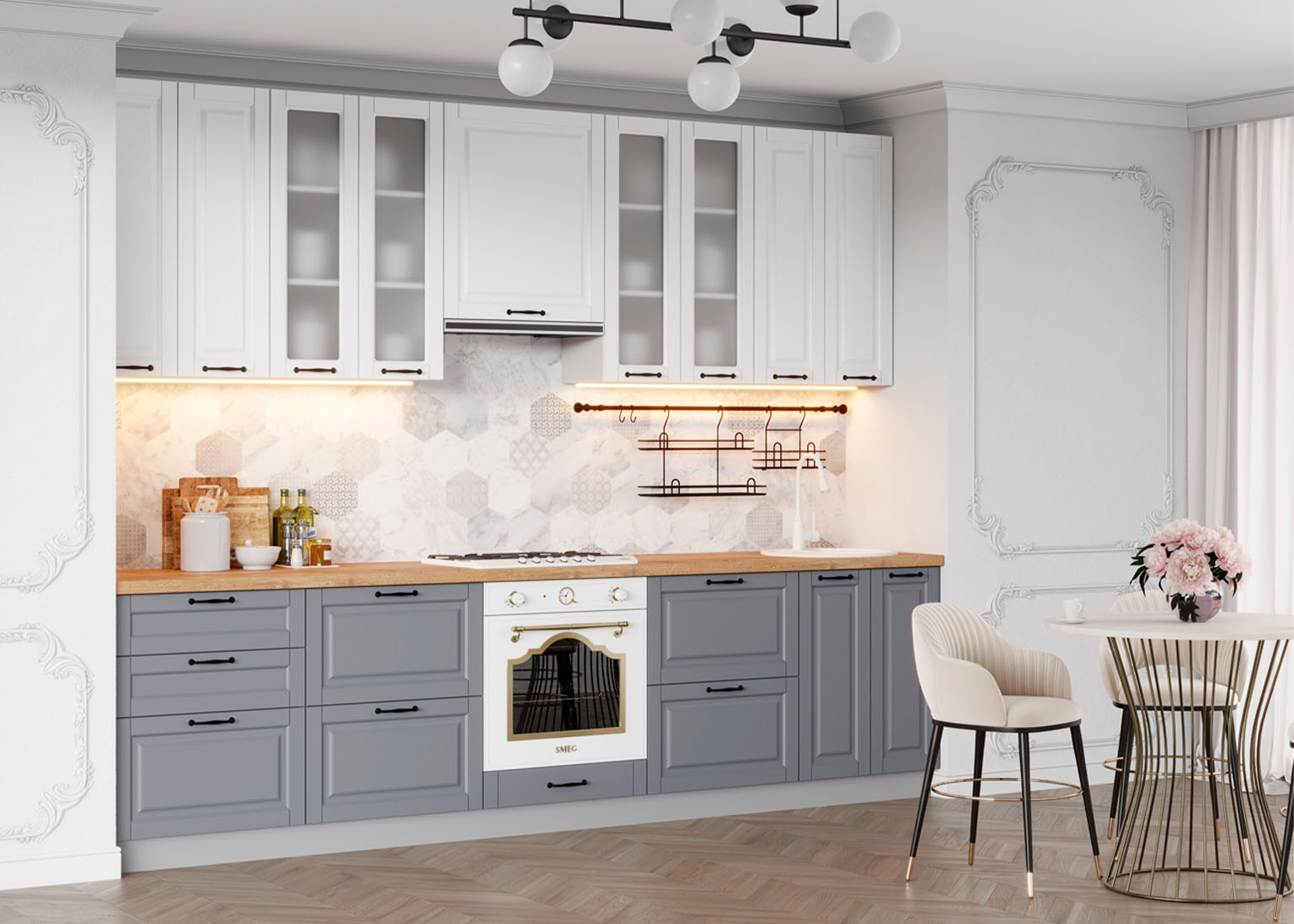 Модульная кухня «Гарда» объединяет симметрию, чёткие геометрические формы и элегантный декор. Никаких излишеств — только стиль и функциональность.