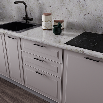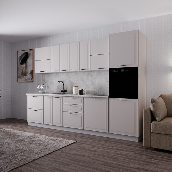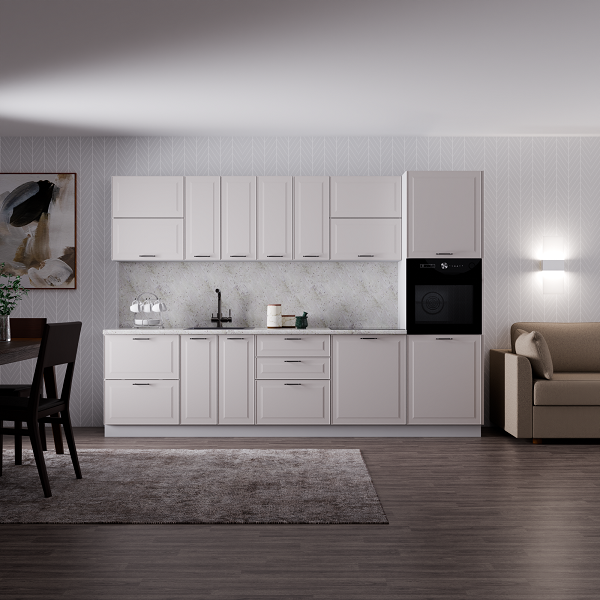 Кухня «Манго» — это сложная фрезеровка в стиле неоклассика. Тонкая минималистичная рамка по периметру придаёт фасадам изысканность, а центральная часть с углублением в виде трёхступенчатой «лесенки» добавляет объём и глубину. Идеальный вариант для тех, кто хочет объединить эстетику и практичность — без компромиссов.