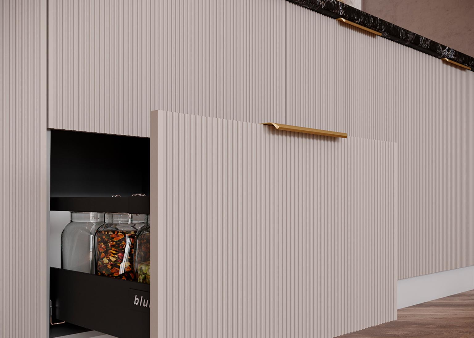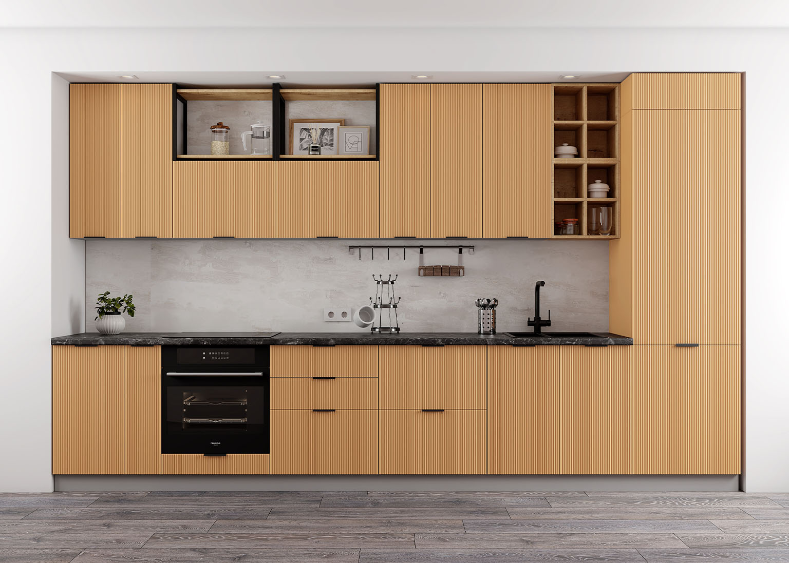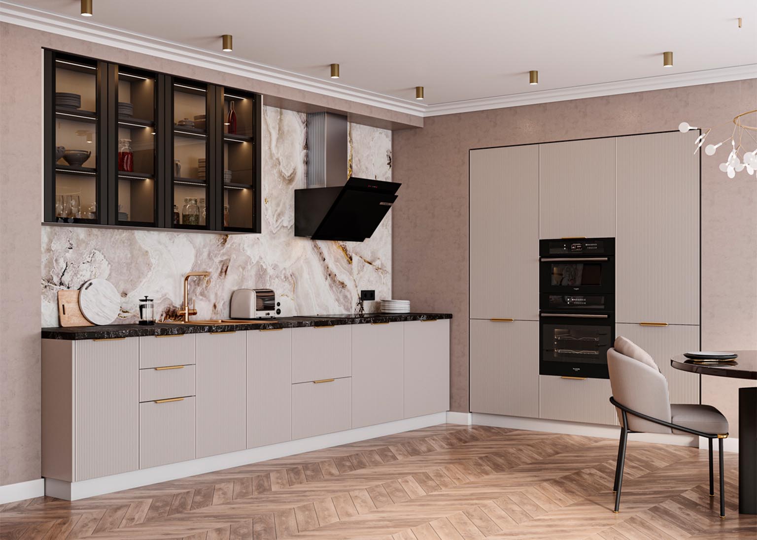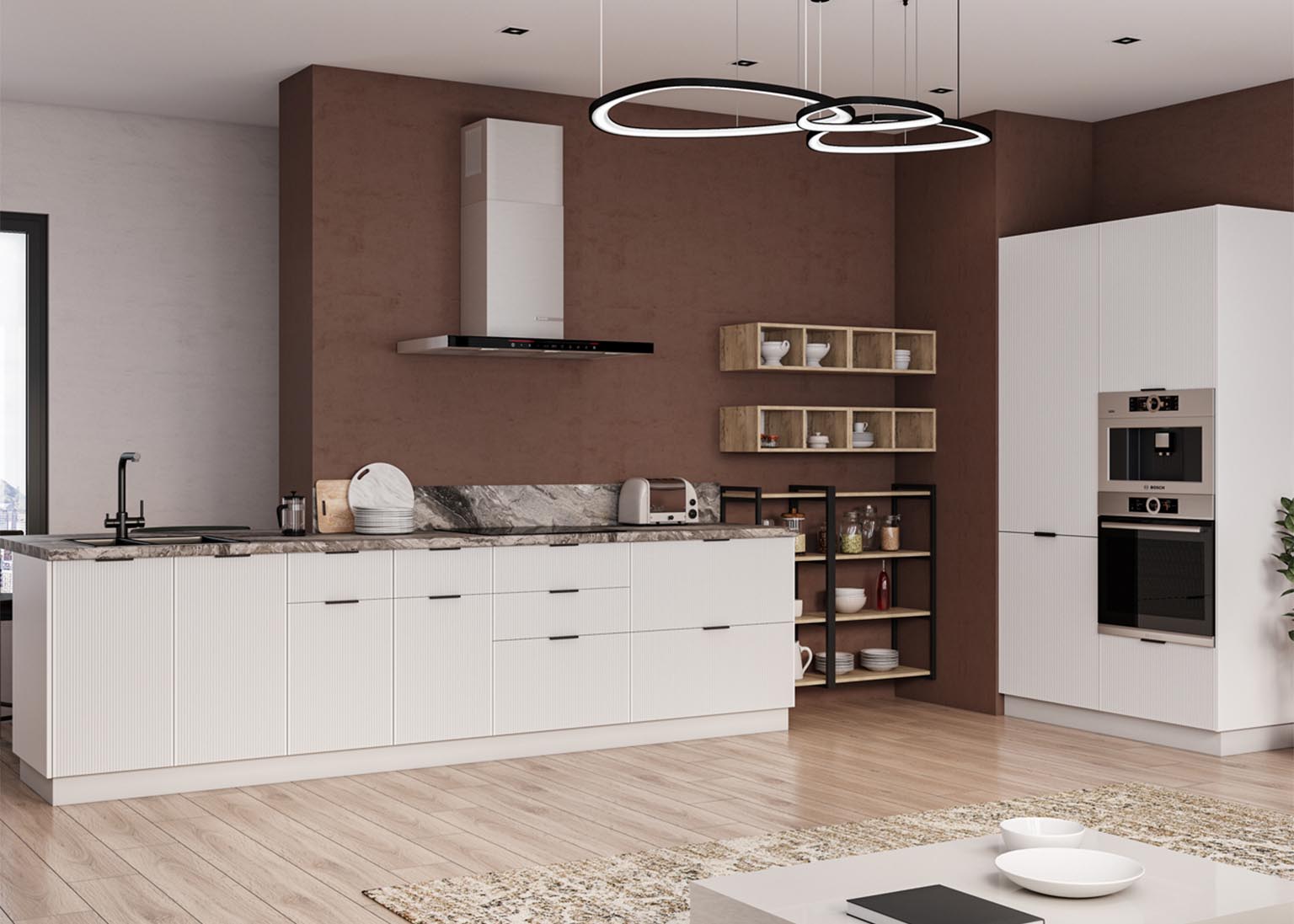 Модульная кухня «Мелисса» имеет фасады в оттенках Скин, которые идеально имитируют фактуру кожи и придают кухонным элементам необычайную тактильность и приятность при касании. Нежные и современные цвета создают уютное пространство, в котором приятно проводить время.