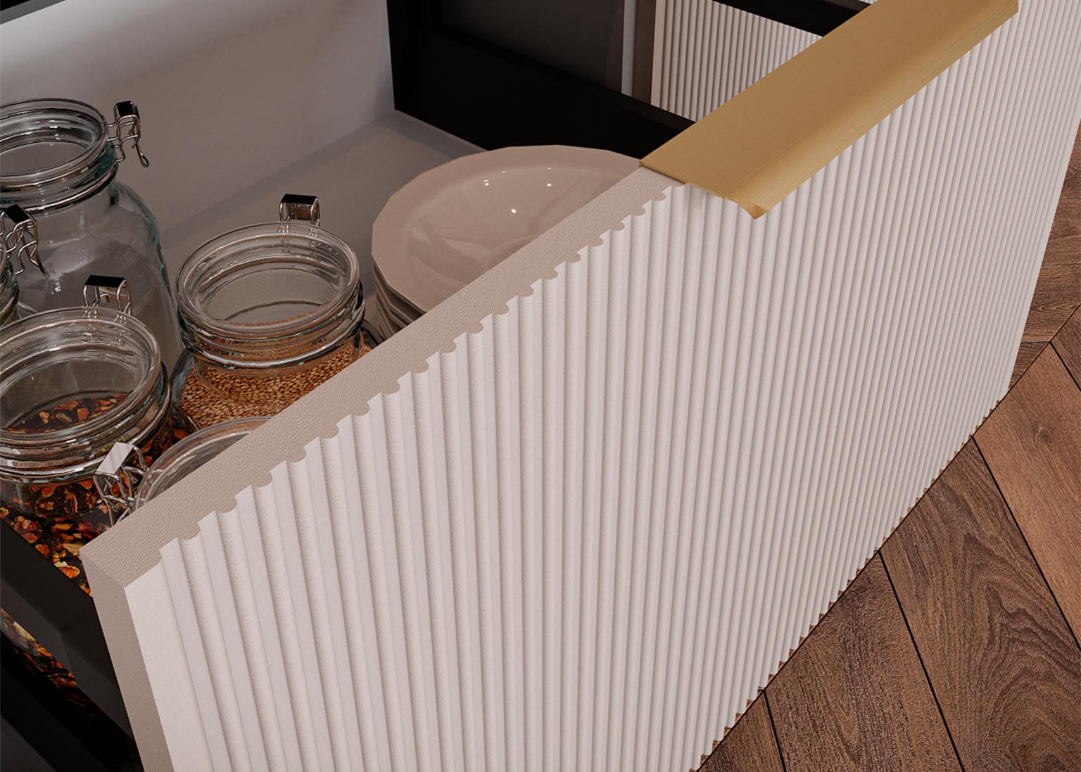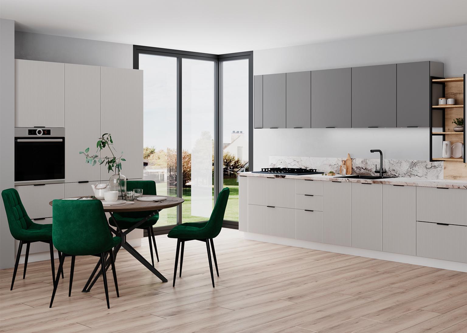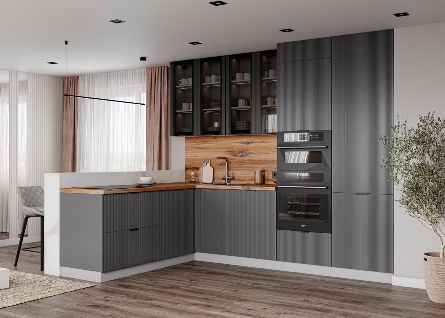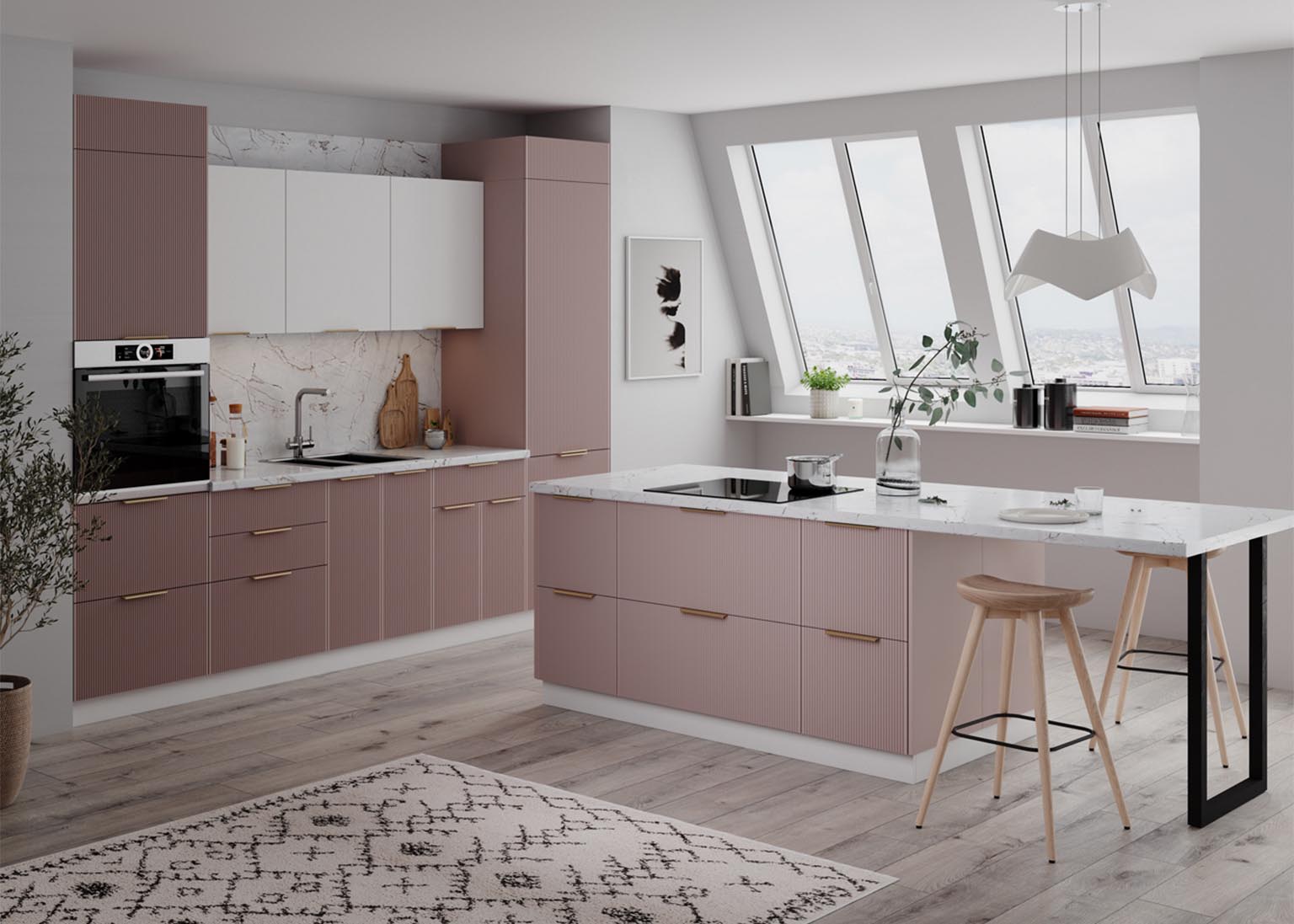 Модульная кухня «Мелисса» имеет фасады в оттенках Скин, которые идеально имитируют фактуру кожи и придают кухонным элементам необычайную тактильность и приятность при касании. Нежные и современные цвета создают уютное пространство, в котором приятно проводить время.