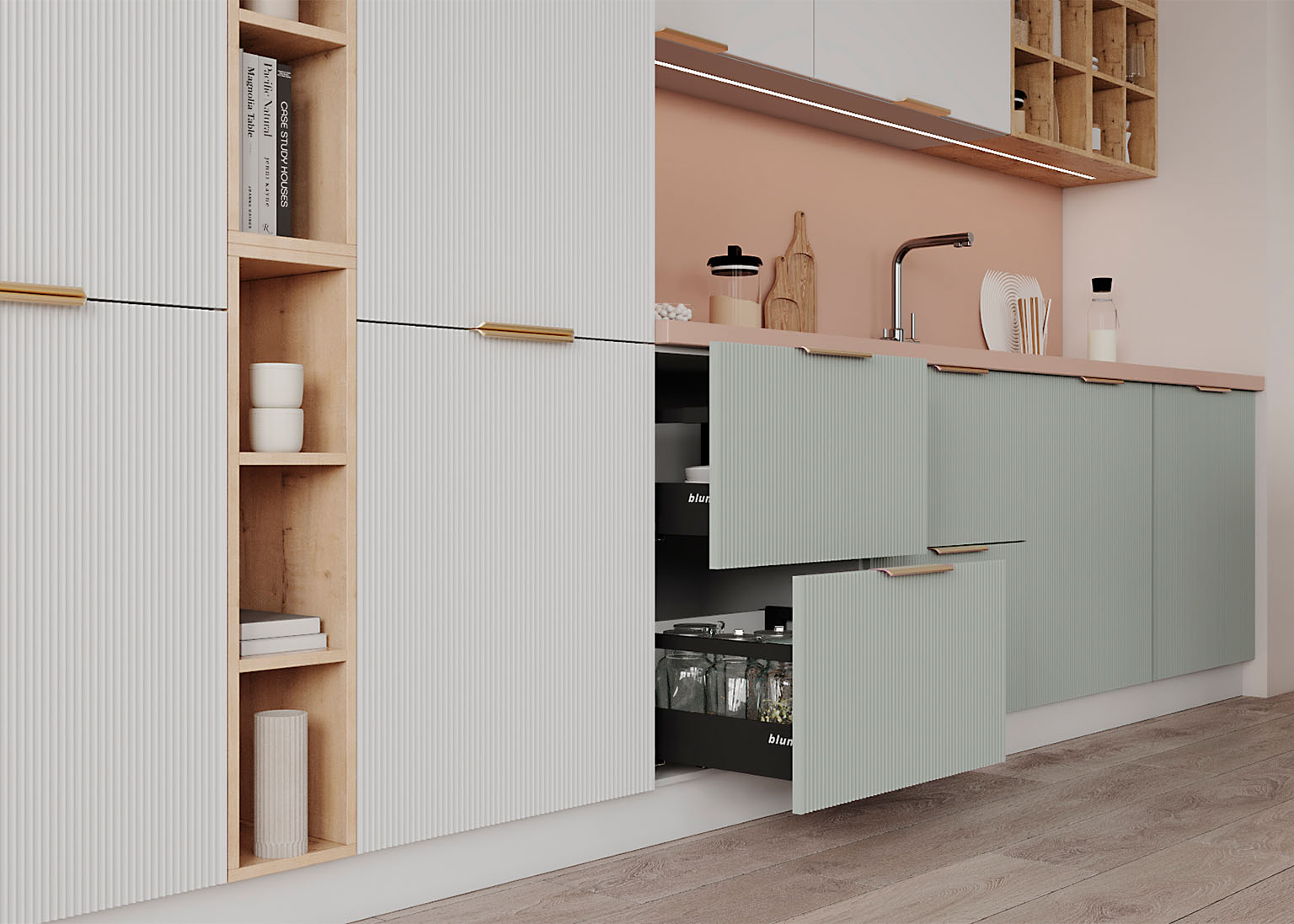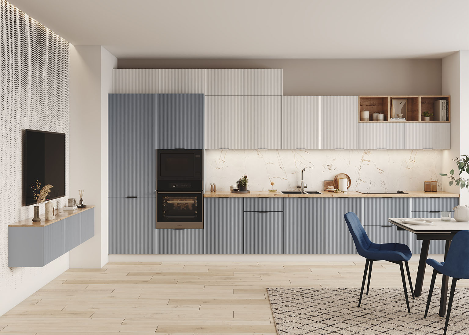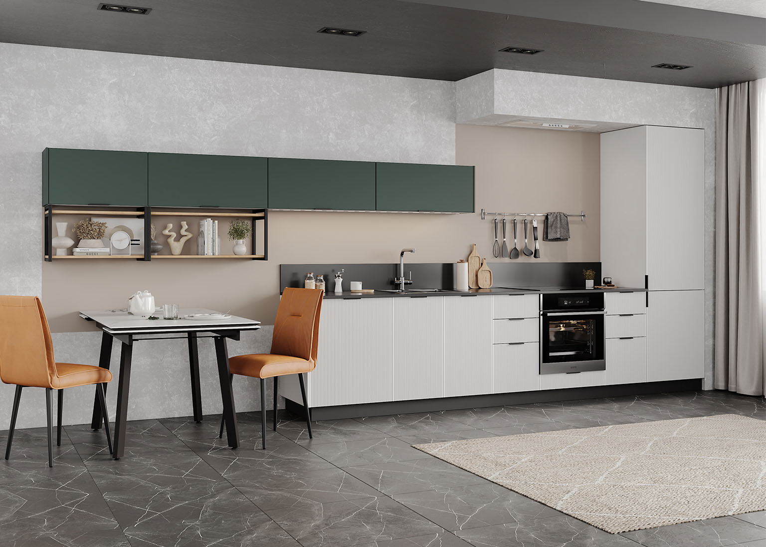 Фасады из уникальной ПВХ-плёнки обладают премиальным видом эмали, но при этом устойчивы к царапинам, пятнам и химическим воздействиям. Гладкая, приятная на ощупь поверхность сохраняет свой безупречный вид даже при интенсивном использовании, поэтому кухня будет не только стильной, но и надёжной на долгие годы.