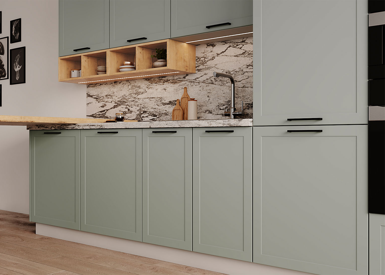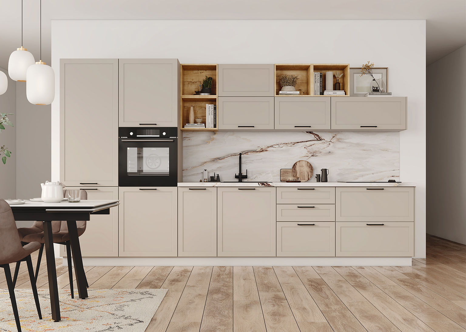 Модульная кухня «Перо» — это больше, чем просто кухня. Это ваш стиль, комфорт и продуманная функциональность в каждой детали. Фасады из инновационной ПВХ-плёнки создают премиальный вид и дарят приятные тактильные ощущения, сохраняя баланс между элегантностью и практичностью. Устойчивые к повреждениям и загрязнениям, они сохраняют свою красоту надолго.