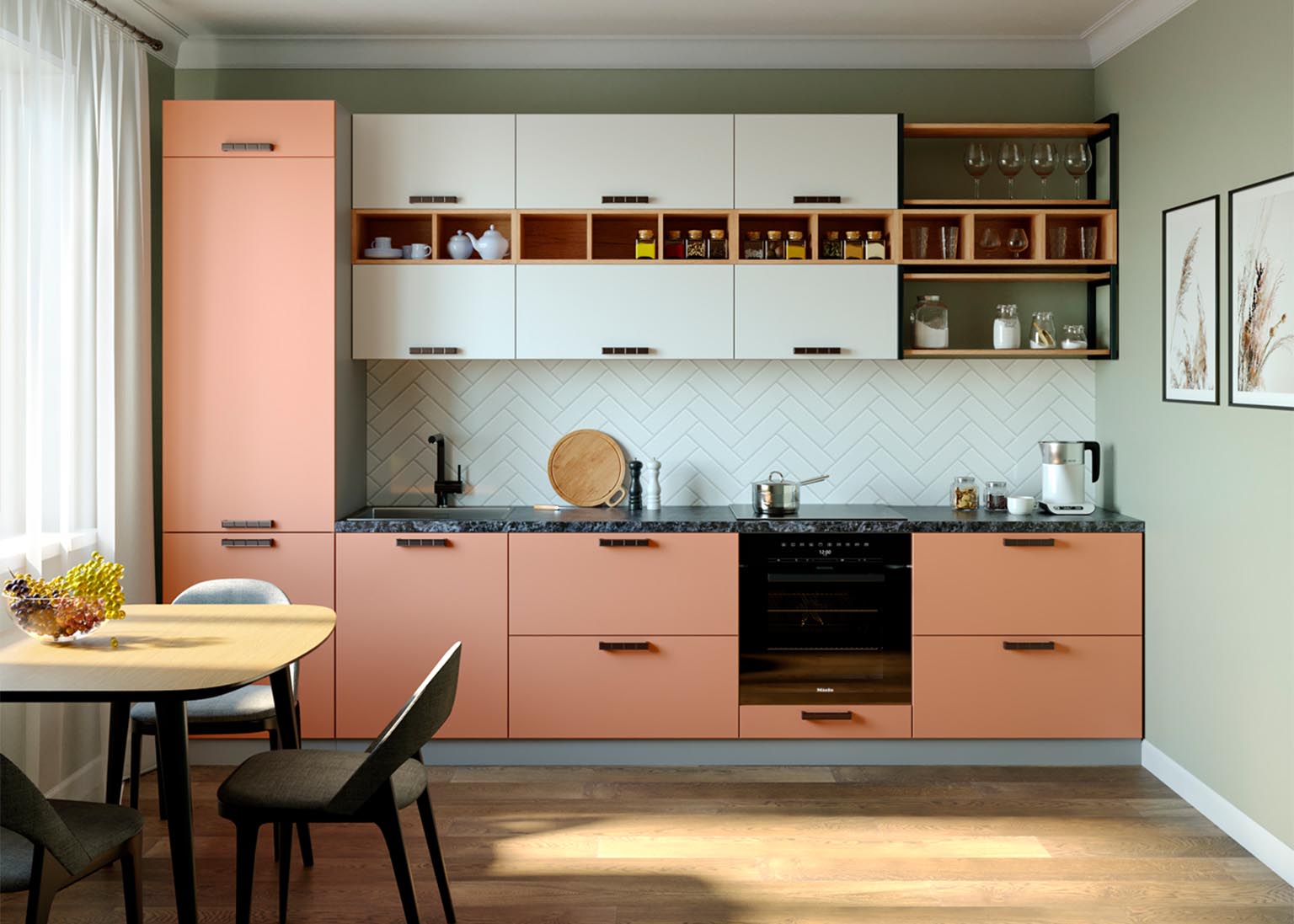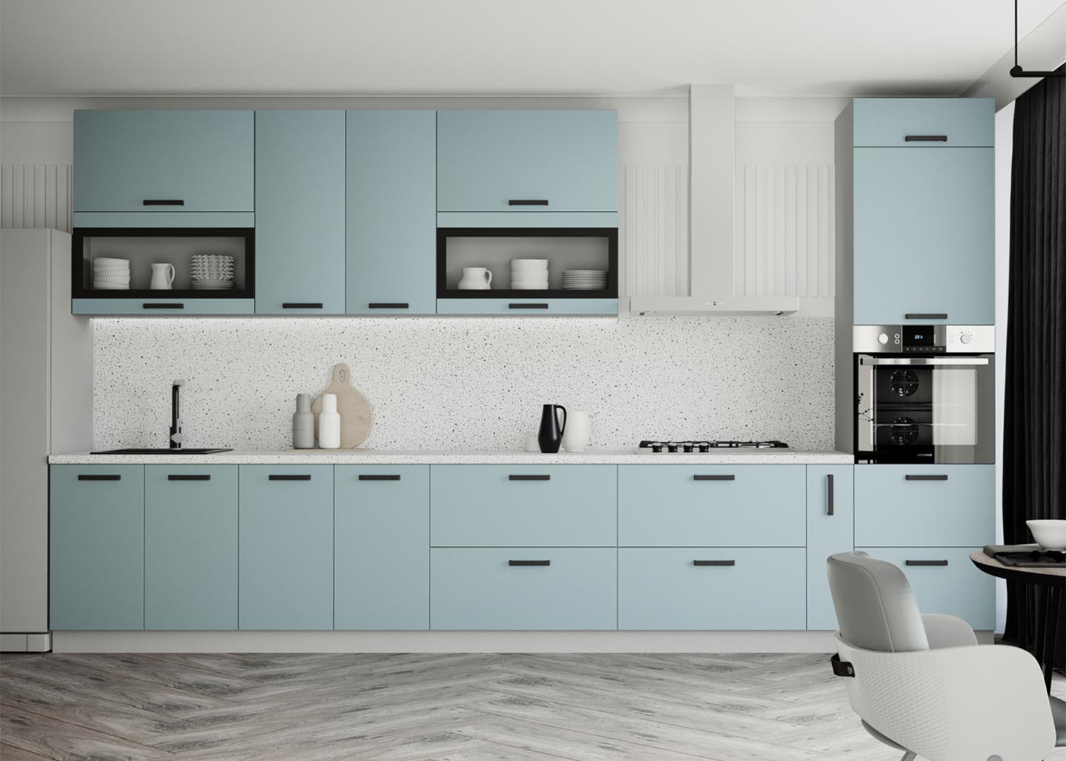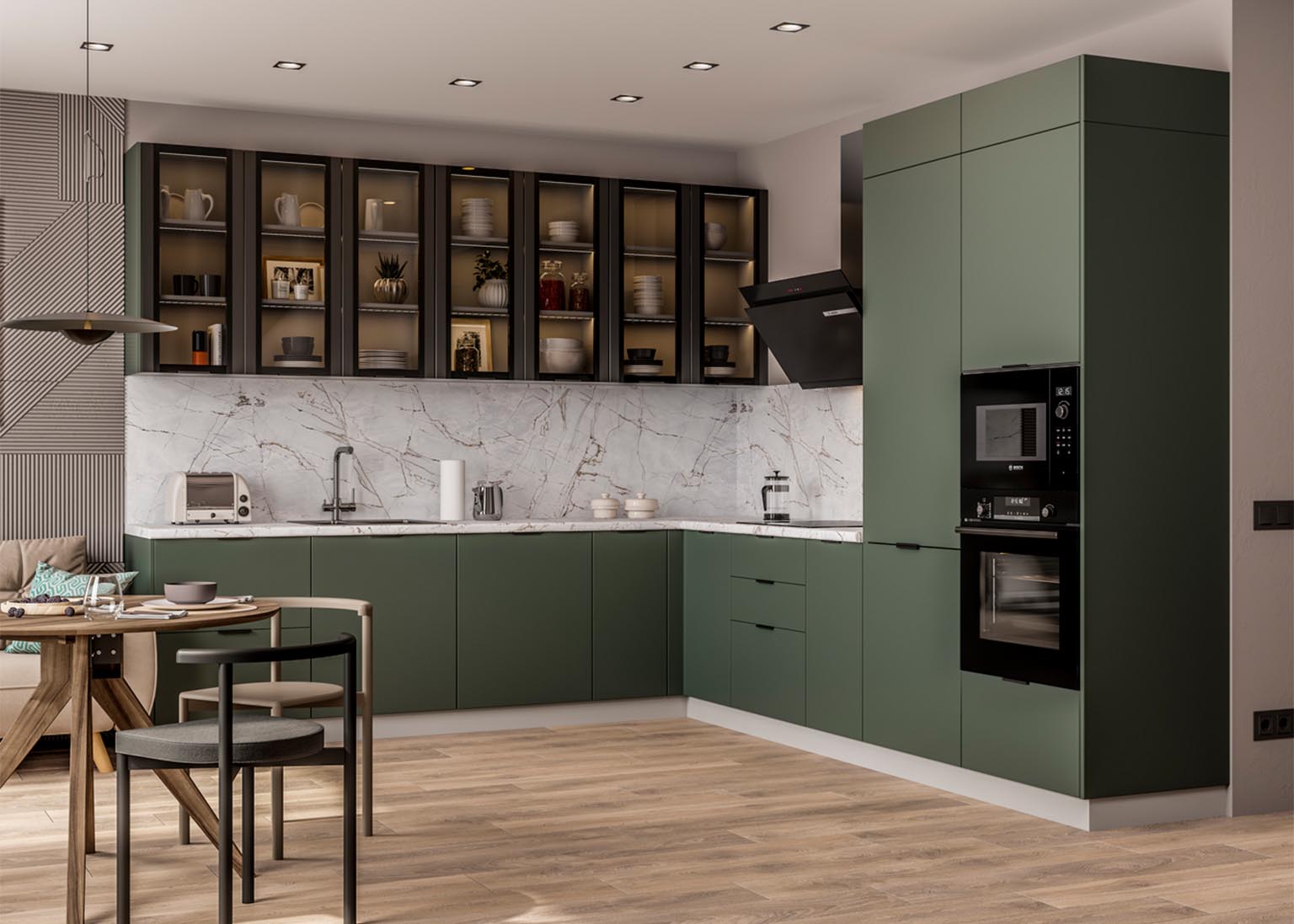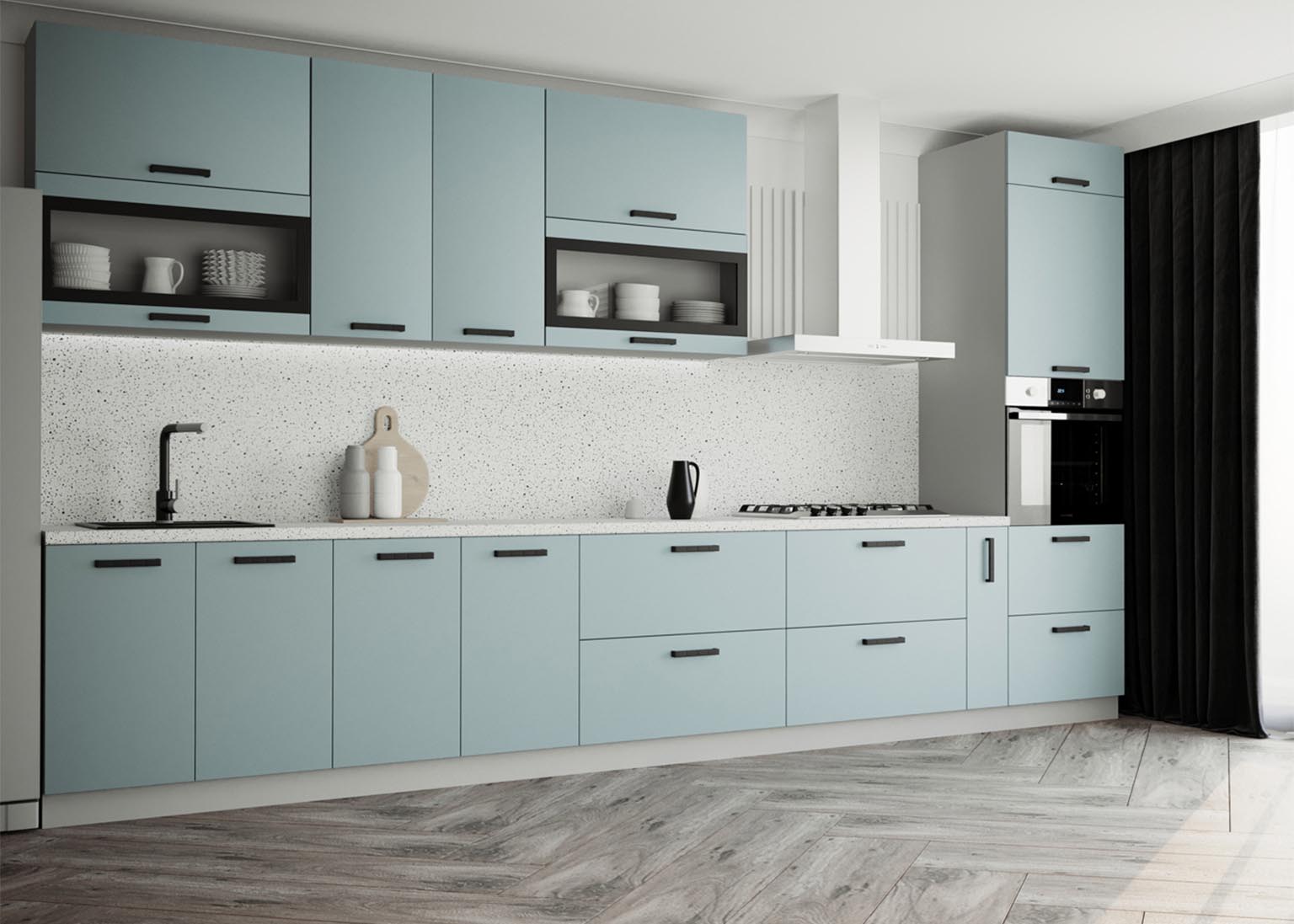 Цветовая палитра подчёркивает стиль и атмосферу кухни. Оттенки белого софта, зелёного софта, грей софта и другие холодные тона создают ощущение простора и лёгкости. Лаконичные фасады можно доукомплектовать любыми ручками, добавляя в интерьер яркие акценты.