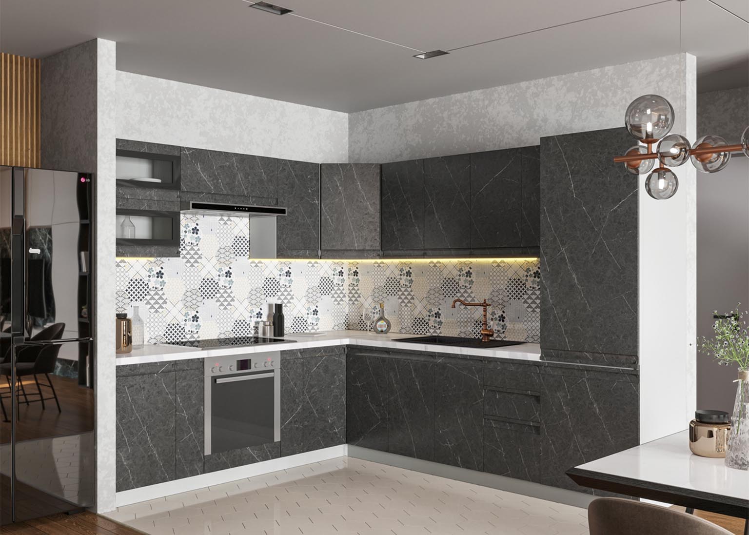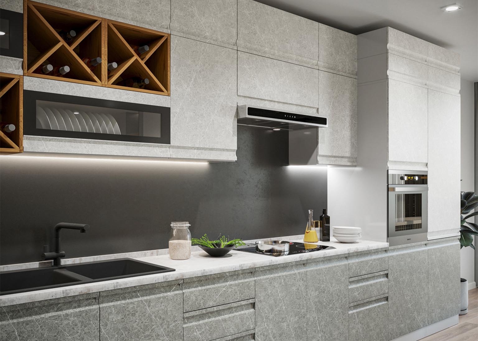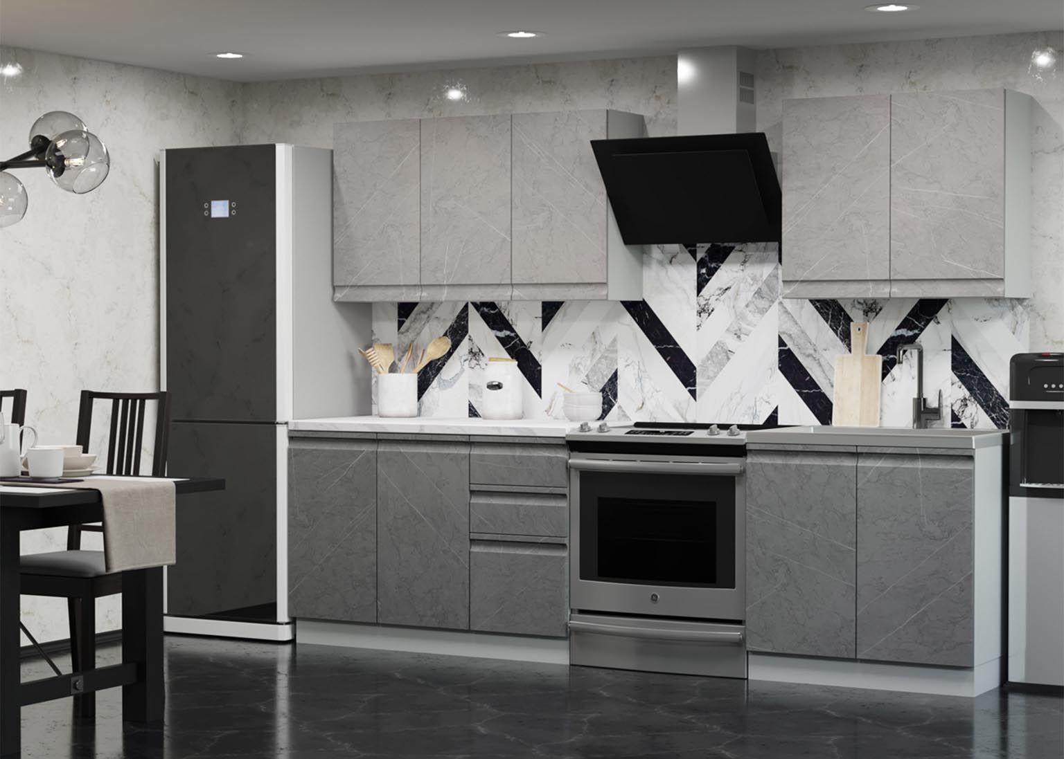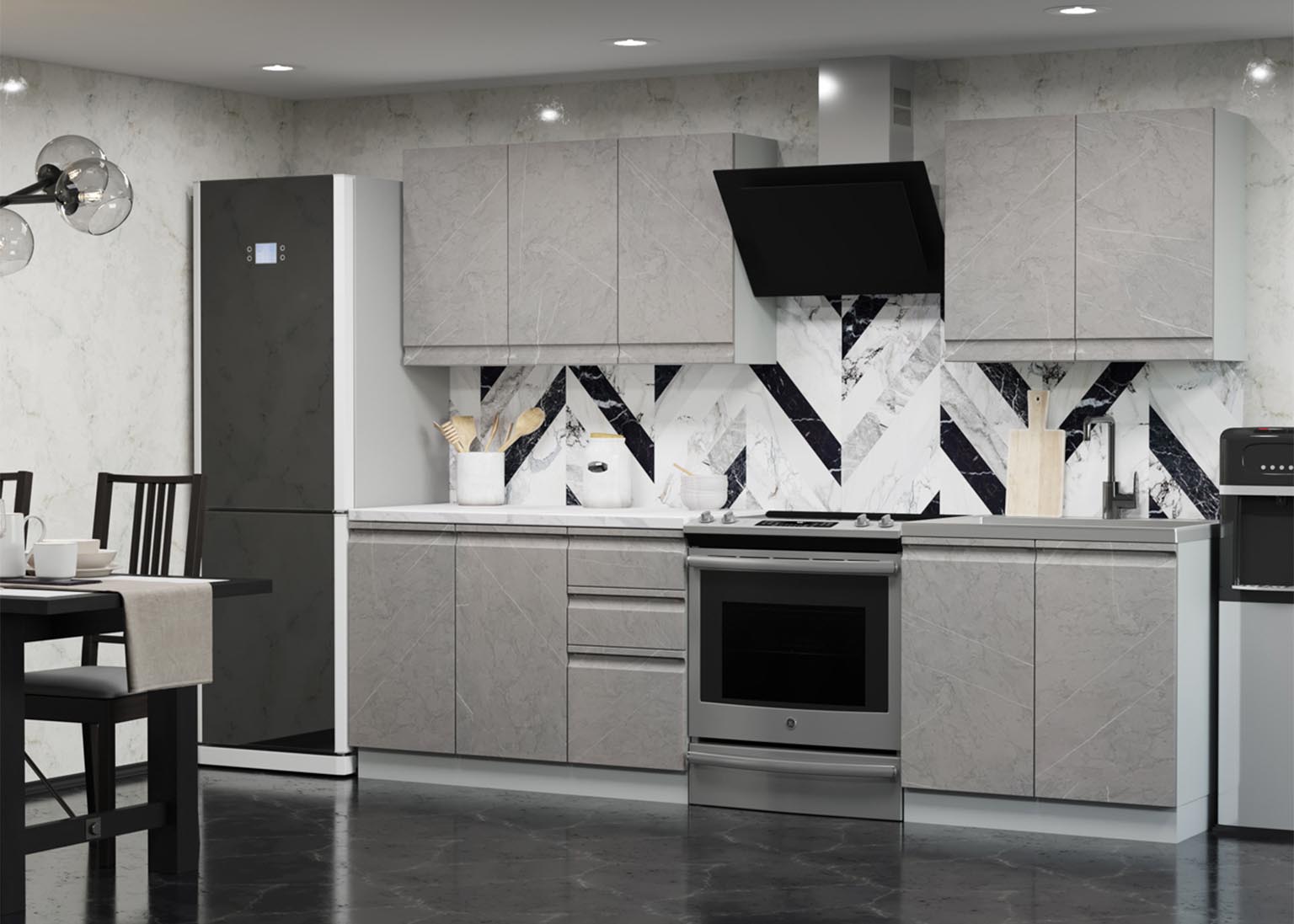 Модульная кухня «Скала» представляет собой сочетание силы и изысканного дизайна, воплощая инновационные решения. Мраморный оттенок поверхностей добавляет пространству элегантности и стиля.
