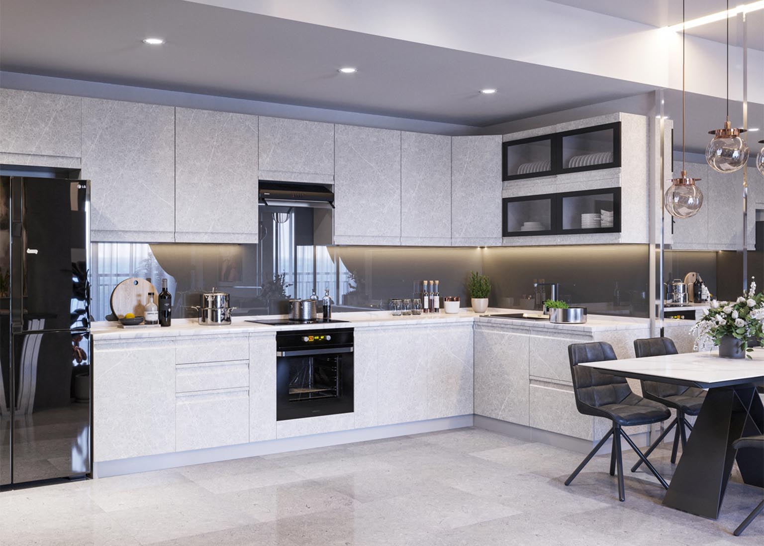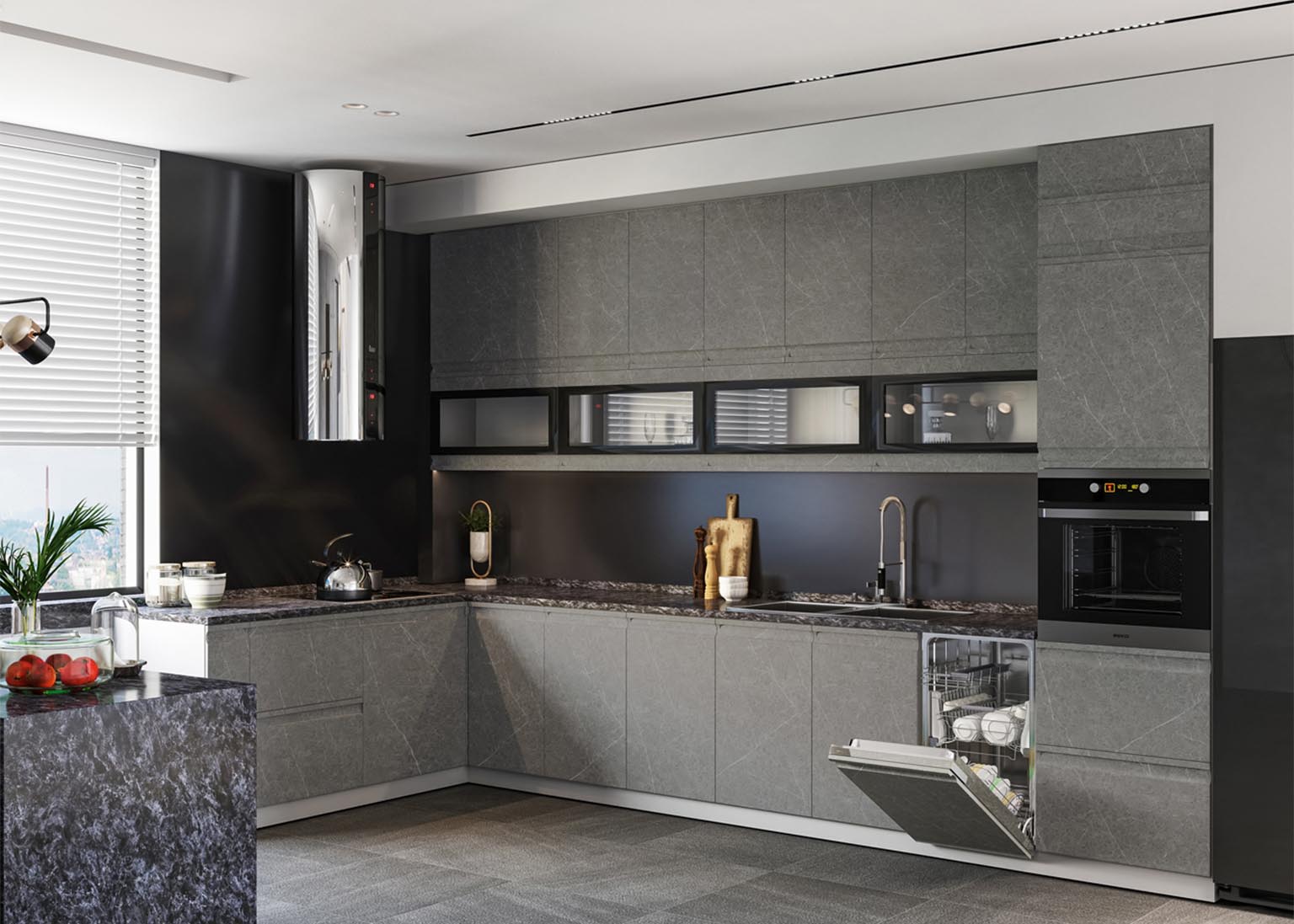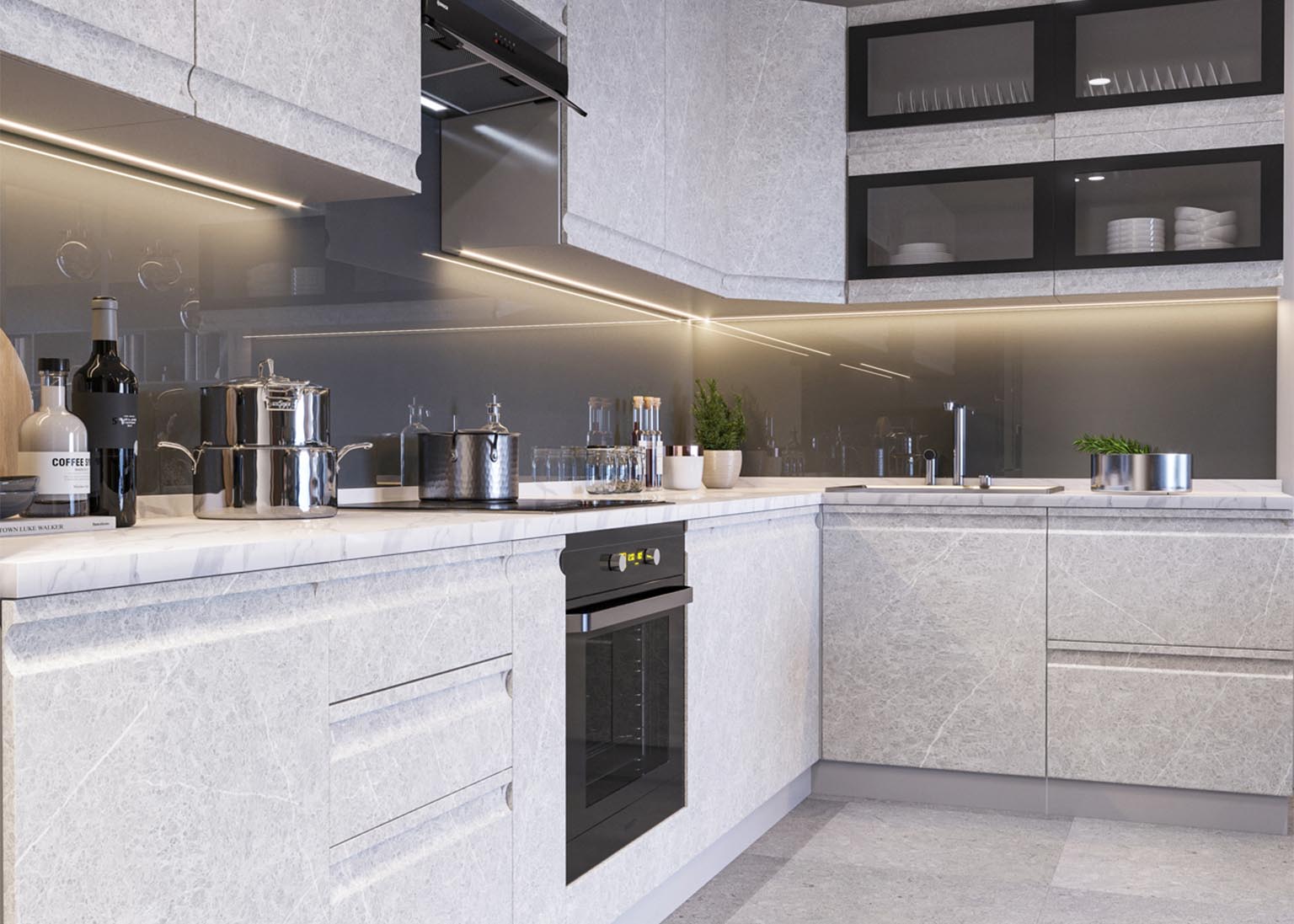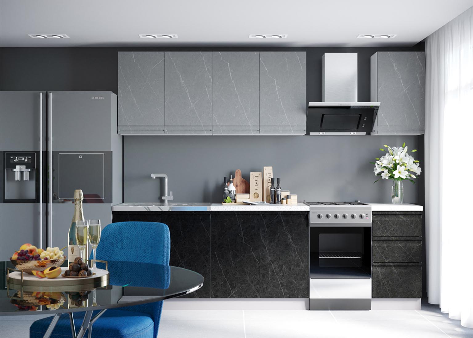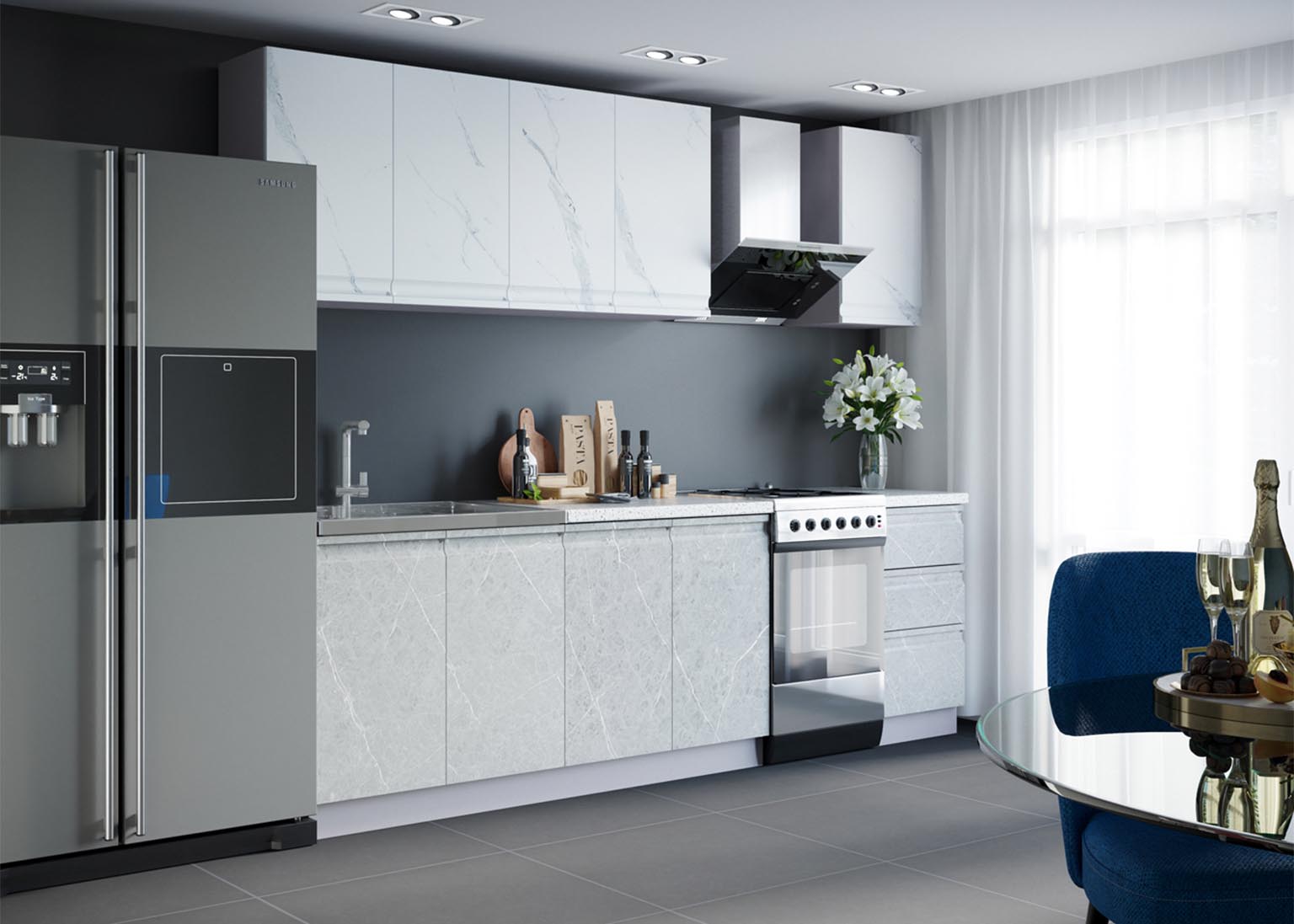 Модульная кухня «Скала» представляет собой сочетание силы и изысканного дизайна, воплощая инновационные решения. Мраморный оттенок поверхностей добавляет пространству элегантности и стиля.