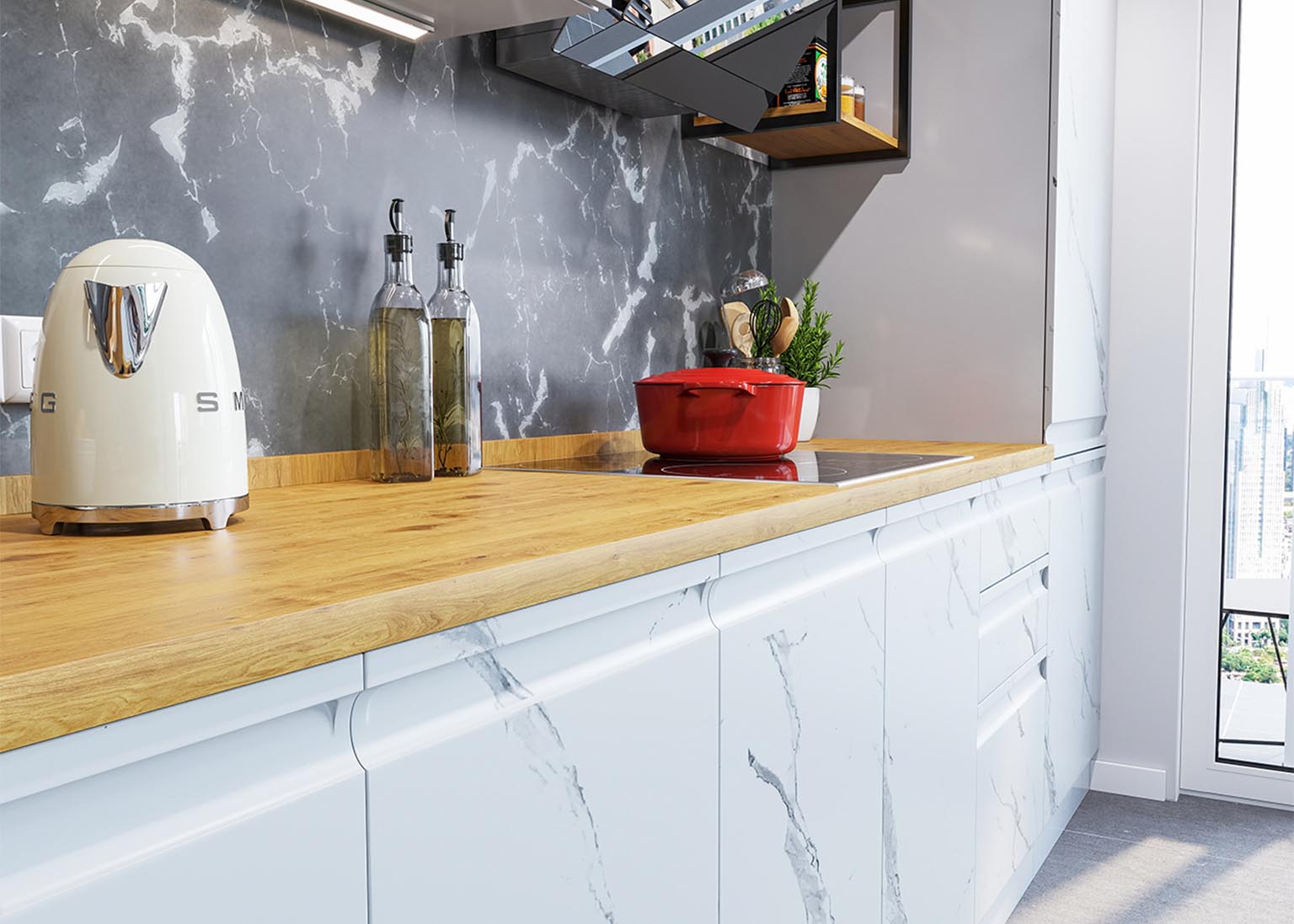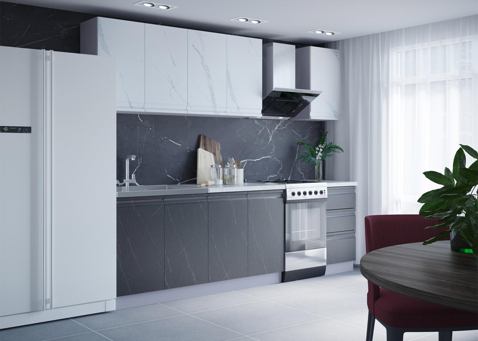 Представленная в цветах мрамора и гранита, кухня «Скала» впечатляет матовыми МДФ фасадами, которые не бликуют и не оставляют отпечатков пальцев, упрощая уход.