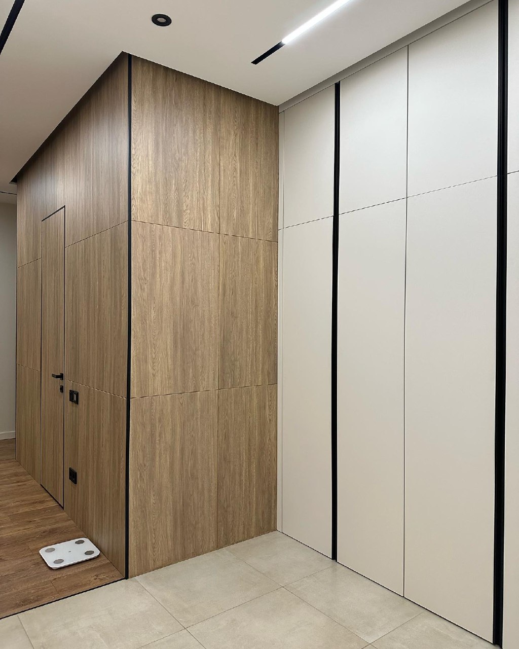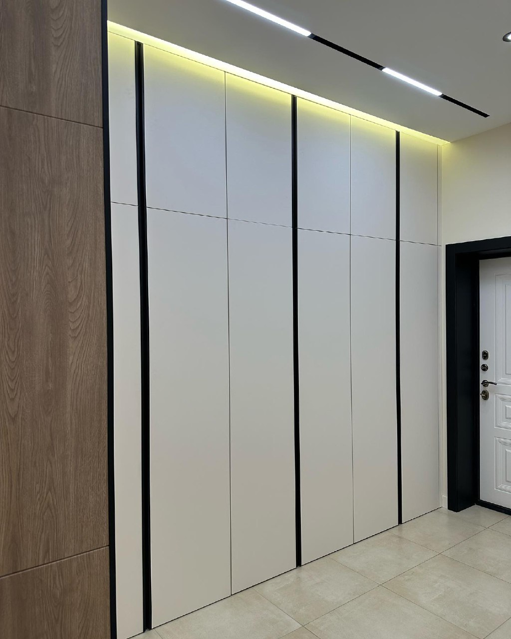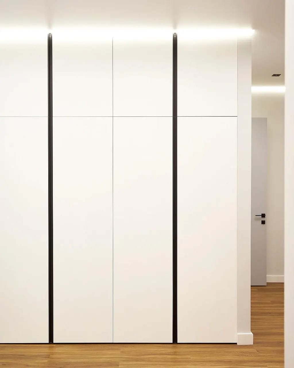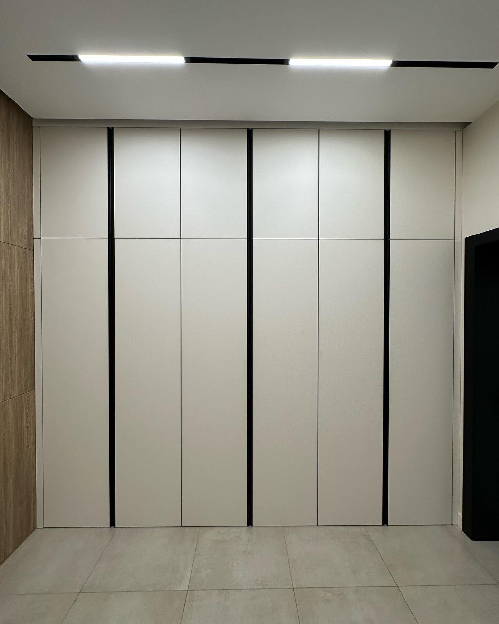 Этот шкаф выполнен в современном минималистичном стиле. Гладкие светлые фасады без ручек создают эффект цельной поверхности, а вертикальные чёрные вставки визуально вытягивают пространство и придают конструкции графичность.
