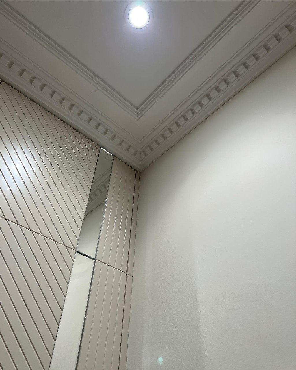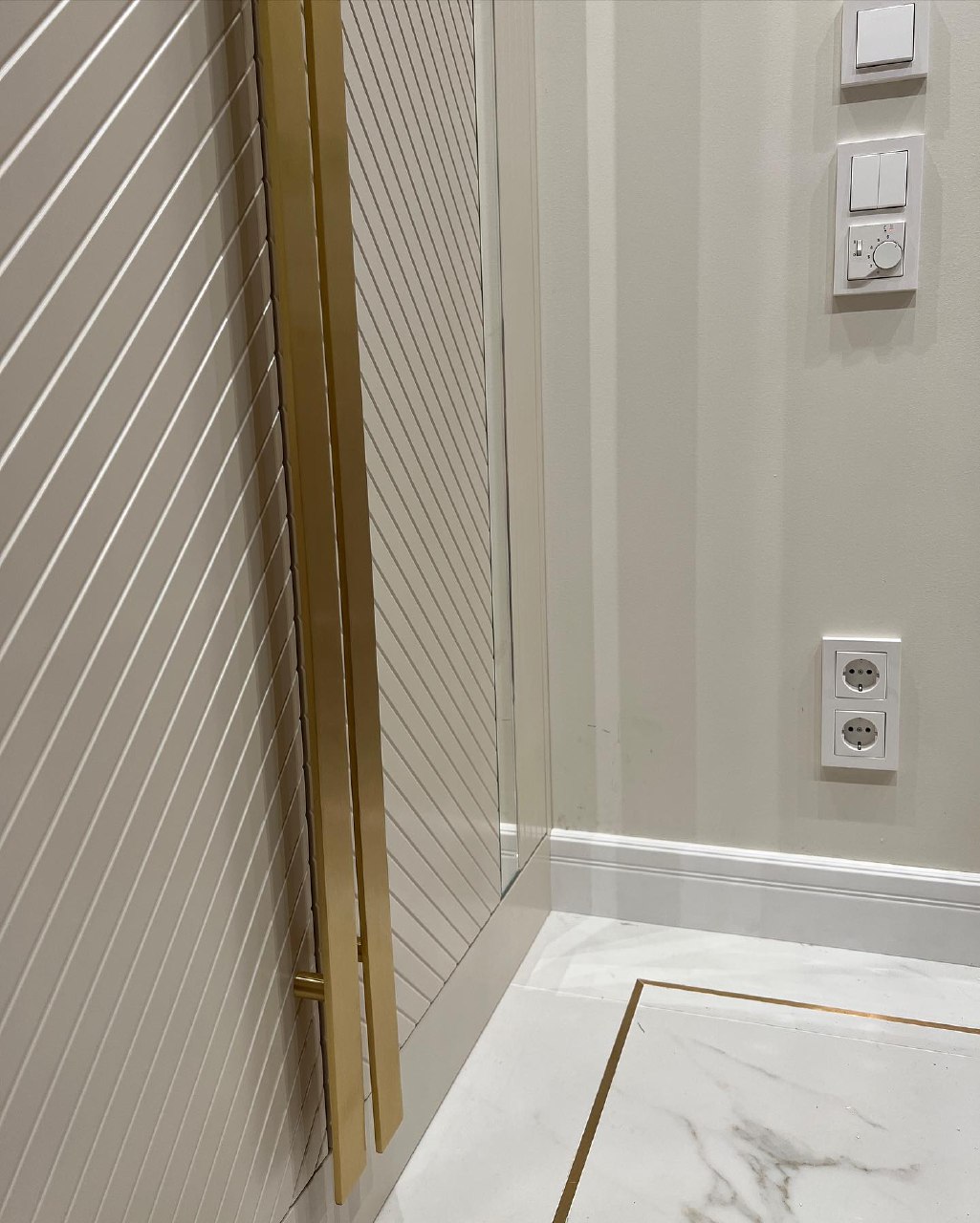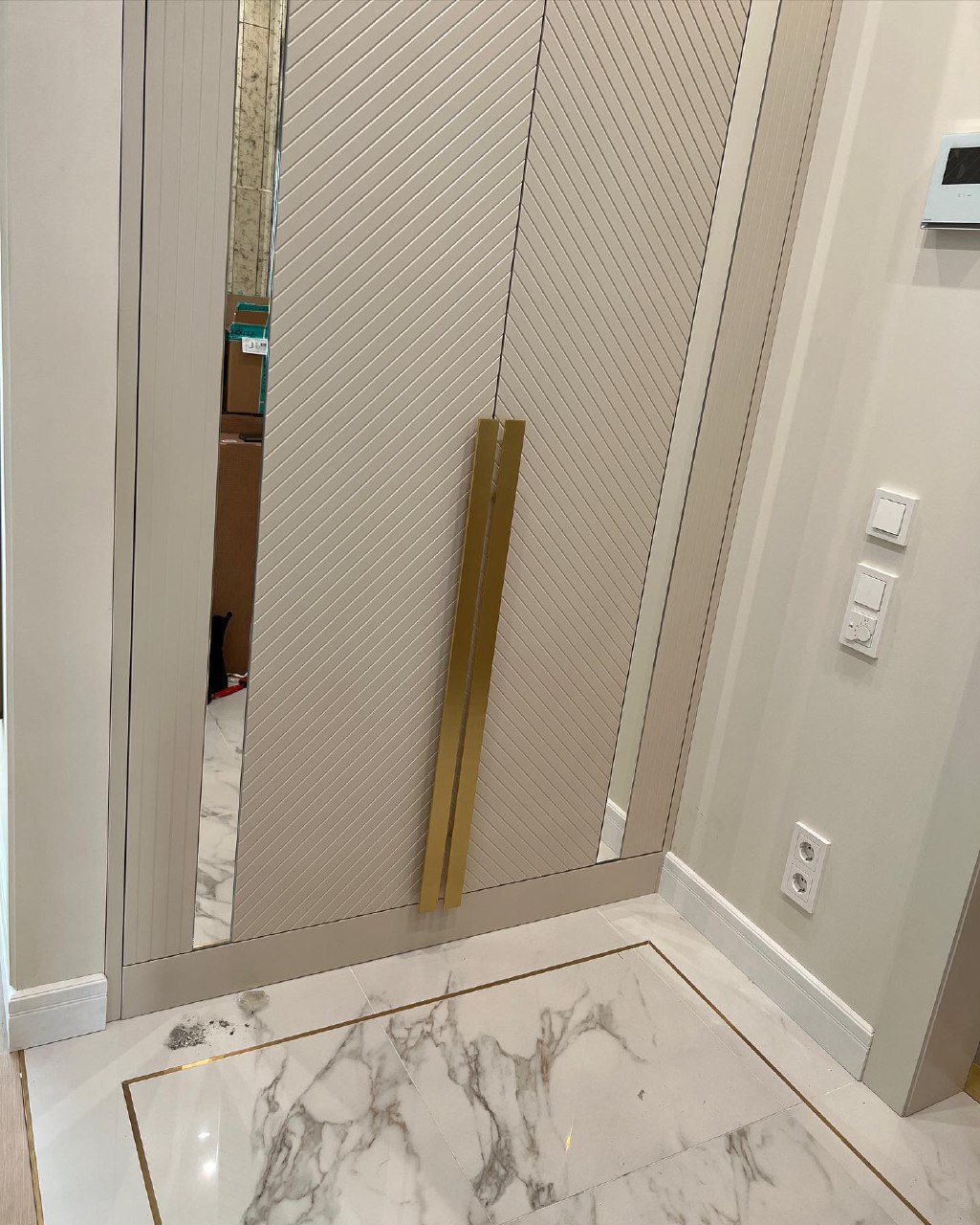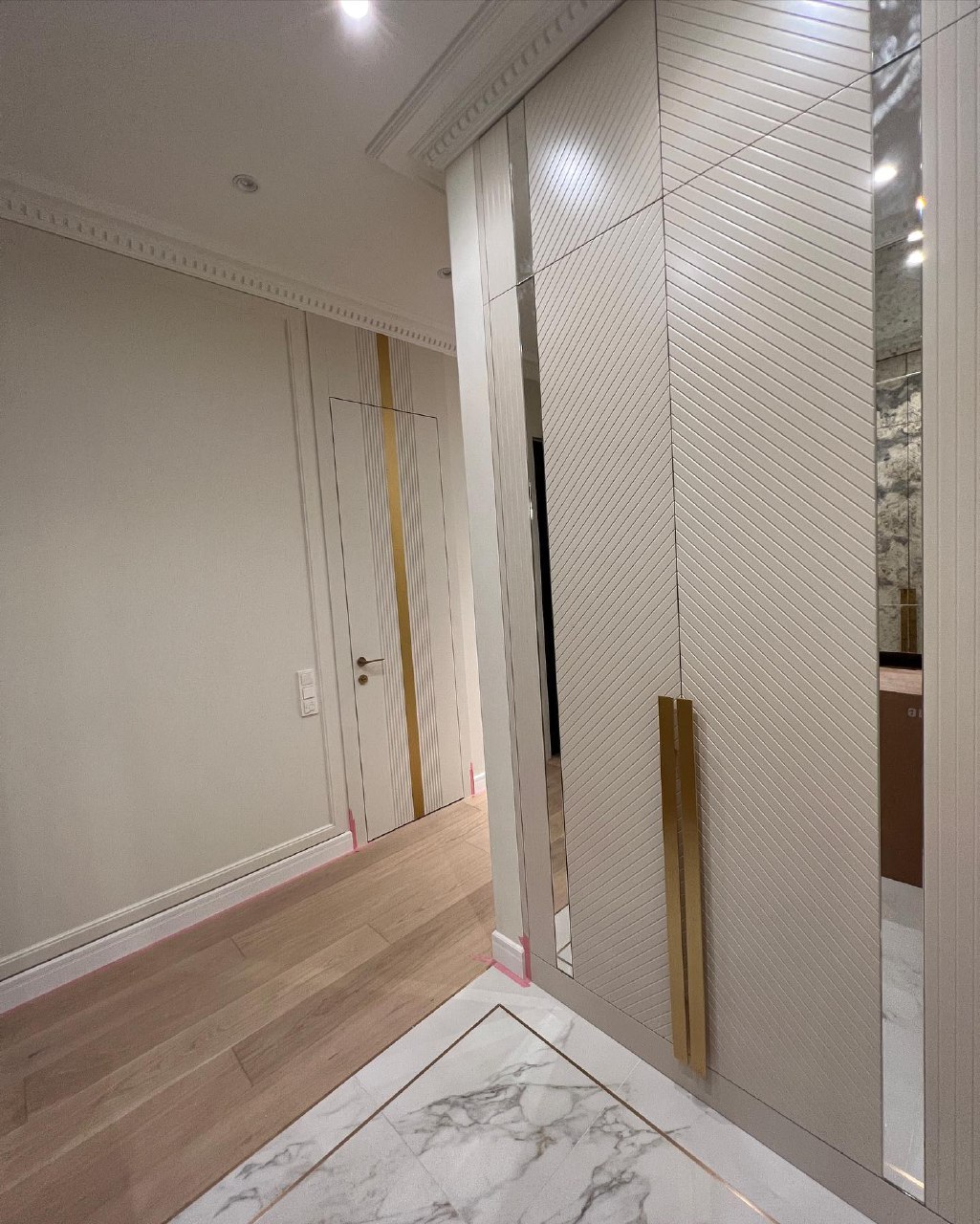 Этот шкаф выполнен в современном стиле с элементами ар-деко. Фасады украшены диагональной фрезеровкой, создающей динамичный рельефный рисунок. Сочетание светлого оттенка поверхности и крупных вертикальных золотистых ручек придаёт конструкции элегантность и выразительность. Зеркальные вставки визуально расширяют пространство и добавляют интерьеру лёгкости. Такой шкаф не только функционален, но и становится стильным акцентом в помещении.