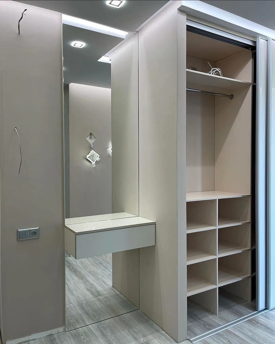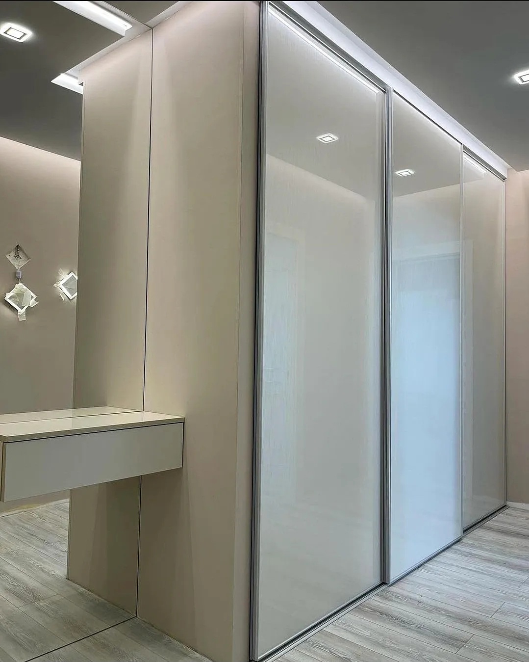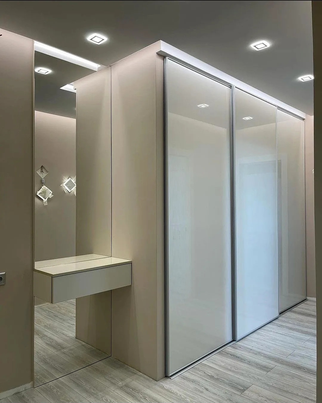 Этот шкаф-купе выполнен в современном минималистичном стиле. Светлые глянцевые фасады с гладкой поверхностью создают эффект лёгкости и визуально увеличивают пространство. Раздвижные двери делают его удобным и функциональным для узких помещений.