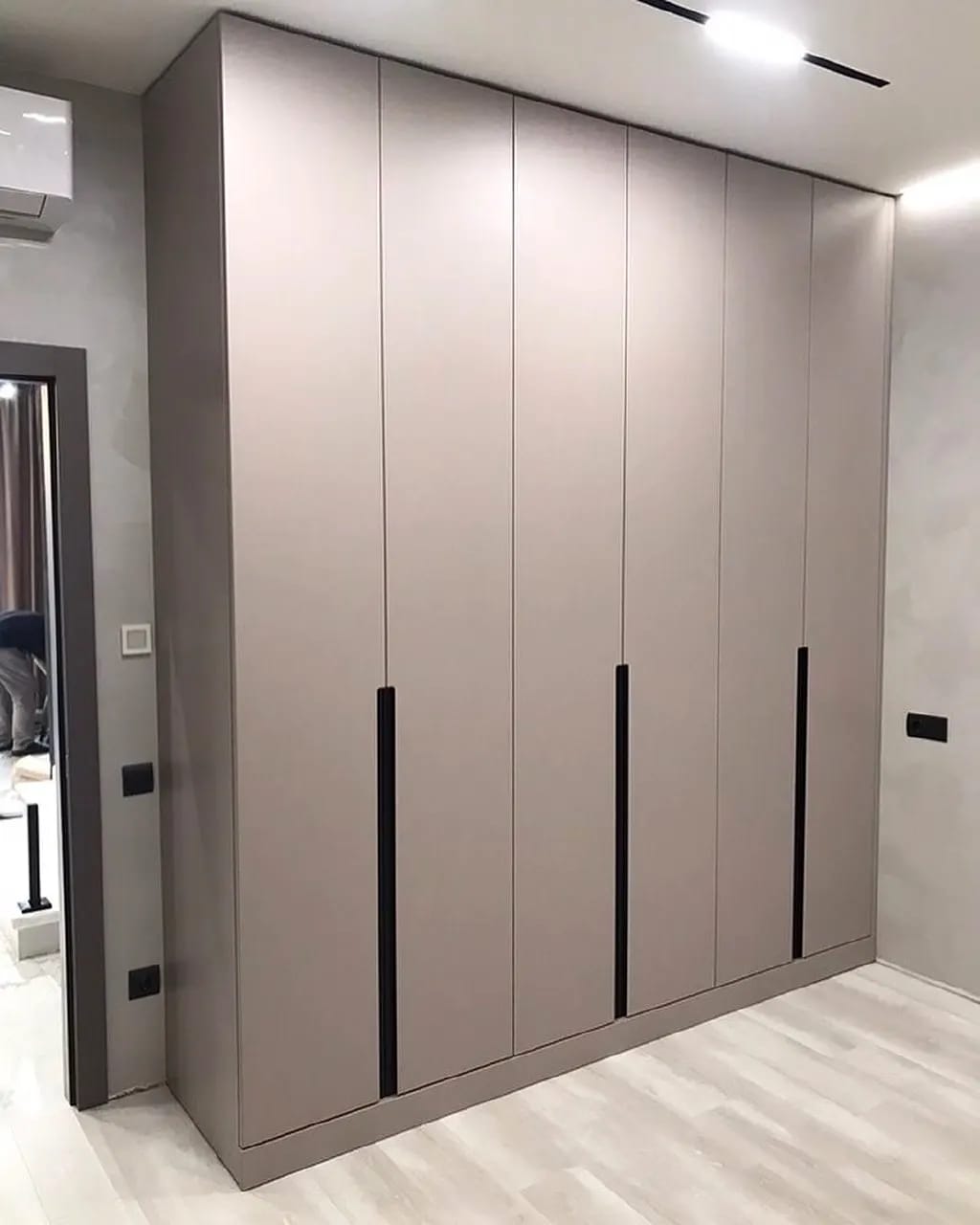 Этот шкаф выполнен в современном минималистичном стиле. Гладкие матовые фасады спокойного бежево-серого оттенка создают лаконичный и элегантный вид. Вертикальные чёрные ручки-вставки подчёркивают строгую геометрию и добавляют графичности. Такой дизайн отлично впишется в современный интерьер, создавая атмосферу аккуратности и стиля.