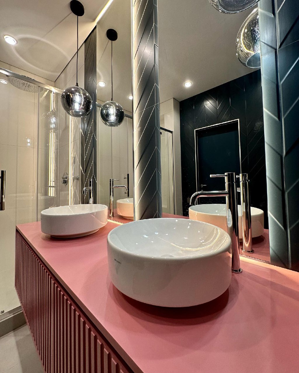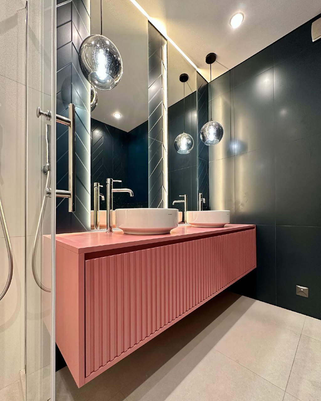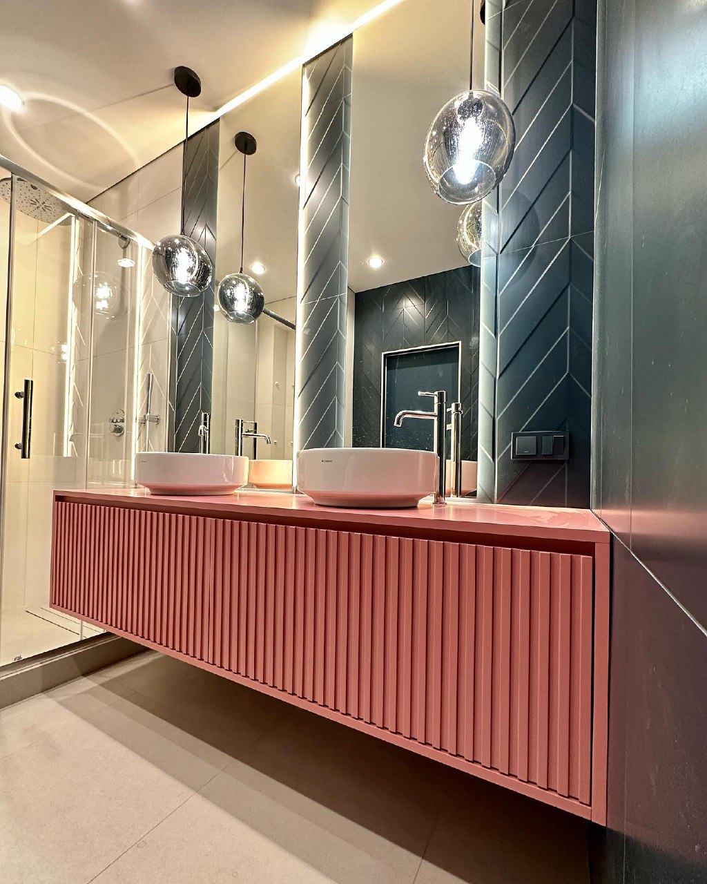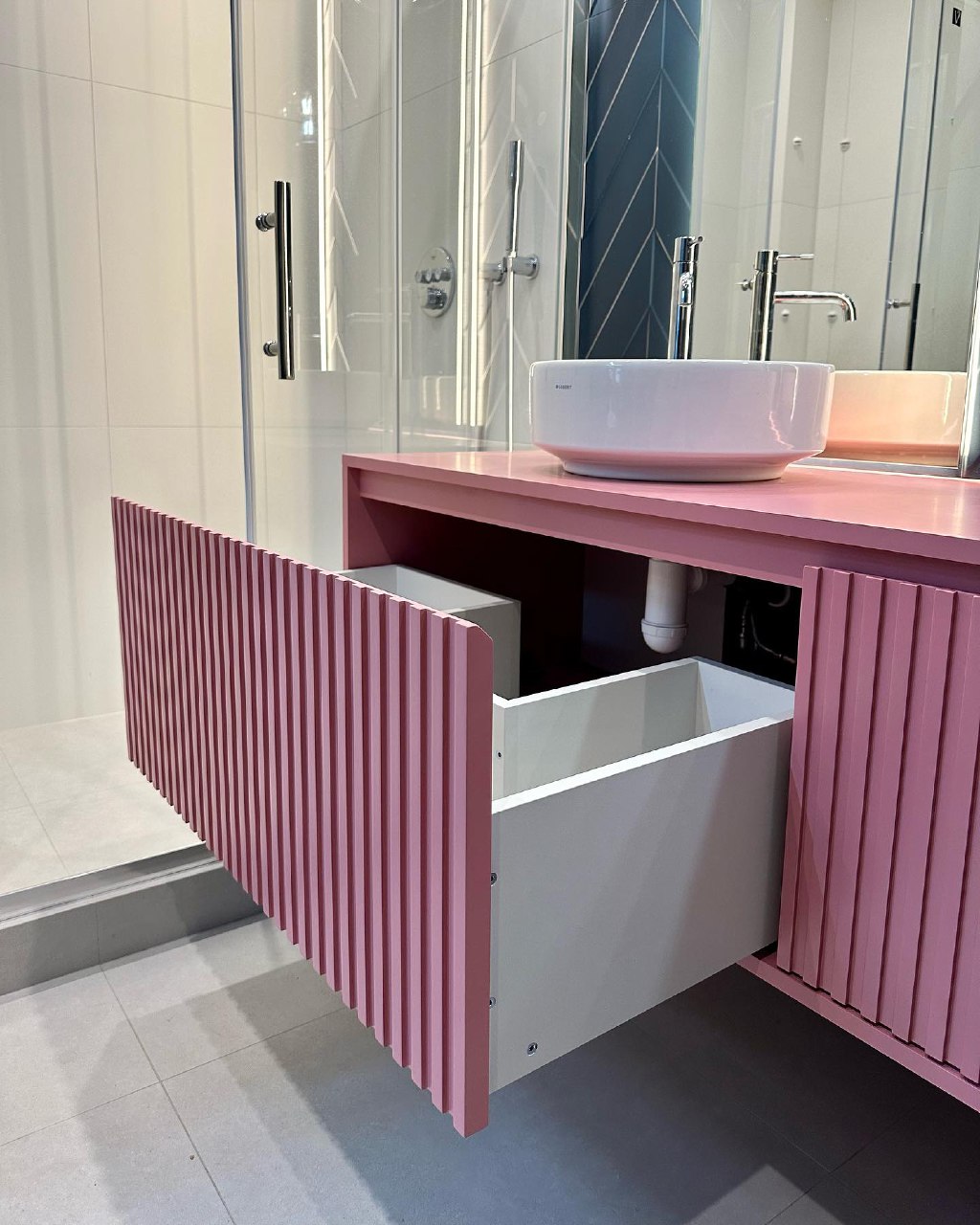 Мебель в ванной комнате выполнена в современном стиле с ярким акцентом. Подвесная тумба насыщенного розового оттенка имеет рифлёные фасады, которые придают текстуру и делают дизайн более выразительным.